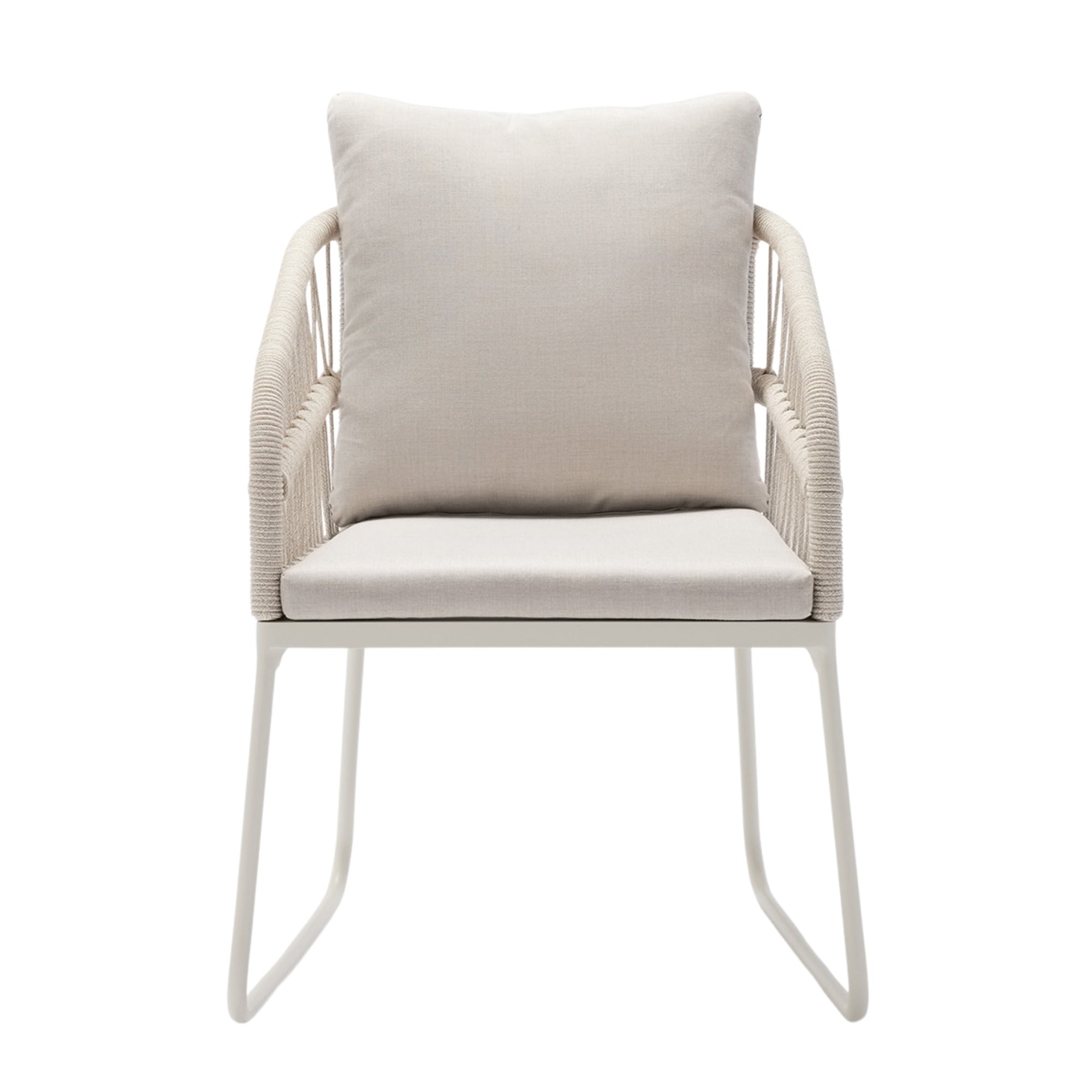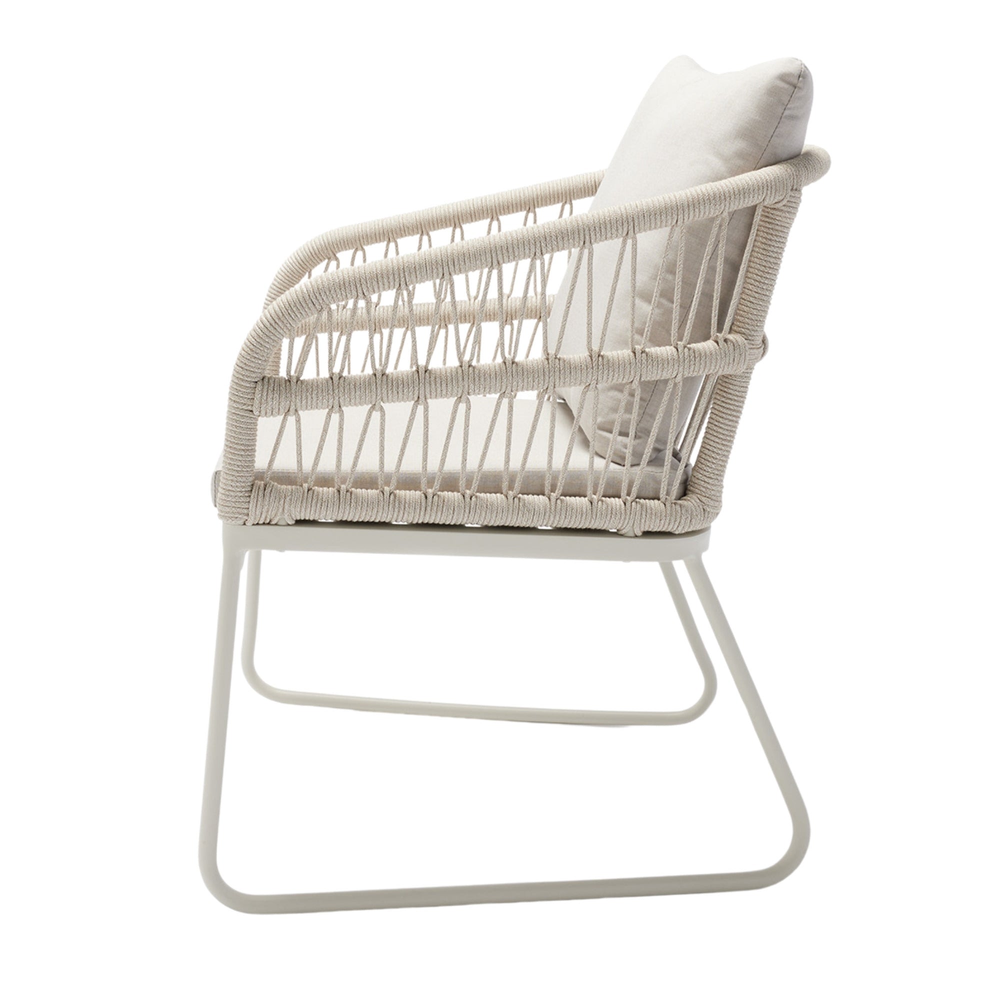 - Widerstandsfähiges Design: Der Gartenstuhl besticht durch seine beige Kordelflechtung, die sich harmonisch in jede Außenumgebung einfügt. Gleichzeitig sorgen das pulverbeschichtete Kufengestell aus Aluminium in Ivory für Langlebigkeit und Stabilität, selbst bei Wind und Regen.