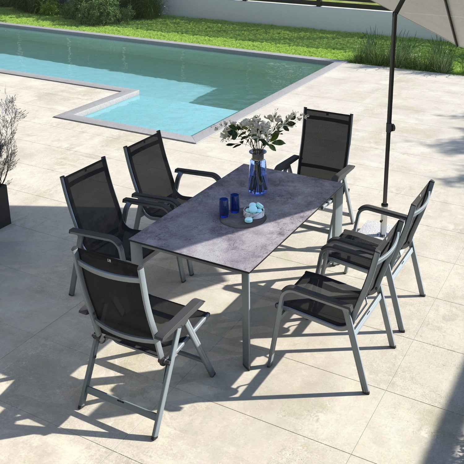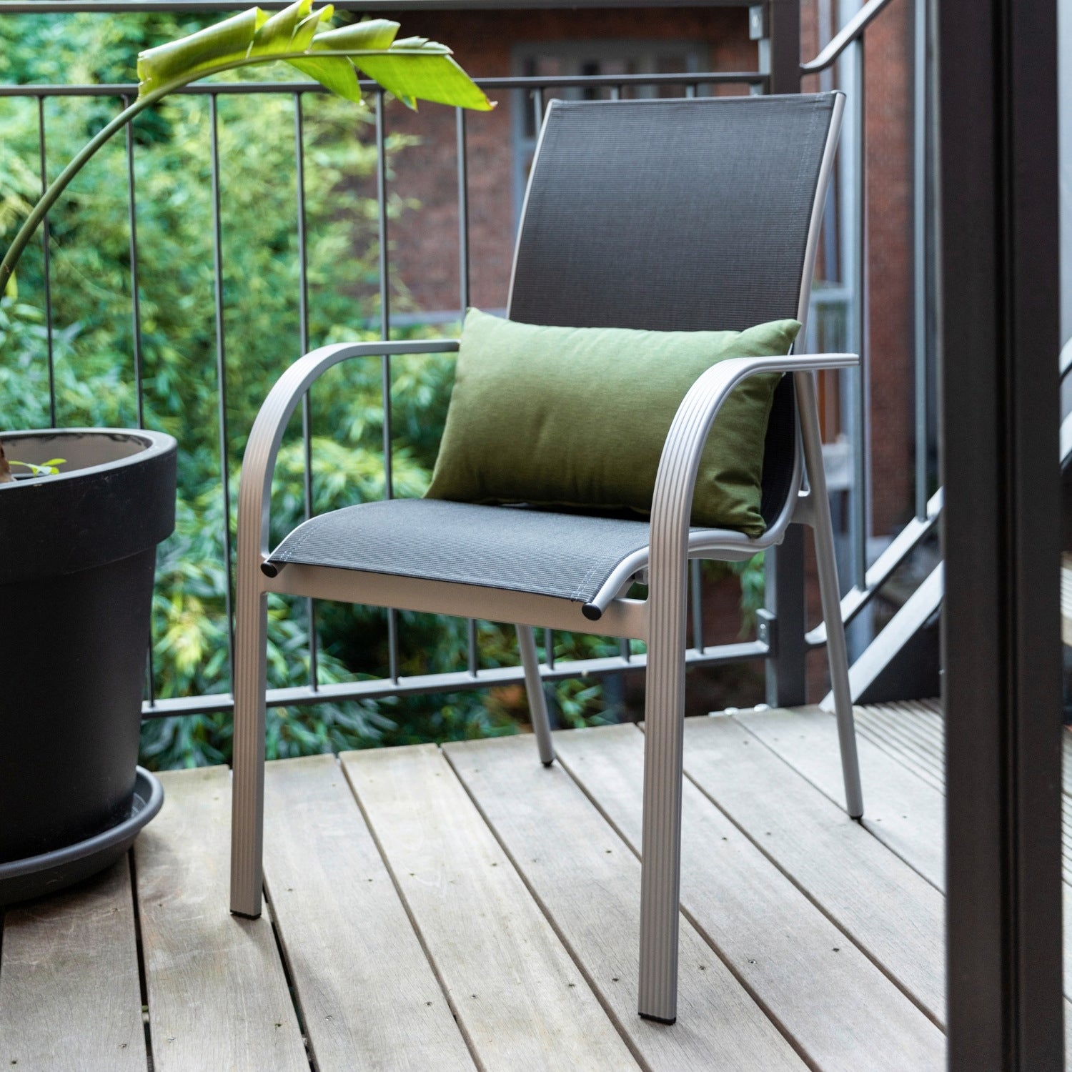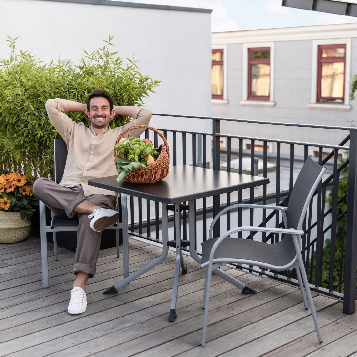 Das schlichte, moderne Design in Silber/Anthrazit verleiht der Kollektion einen zeitlosen Look. Die Möbel sind stapelbar und klappbar, was nicht nur praktisch für die Nutzung ist, sondern auch eine platzsparende Lagerung ermöglicht.