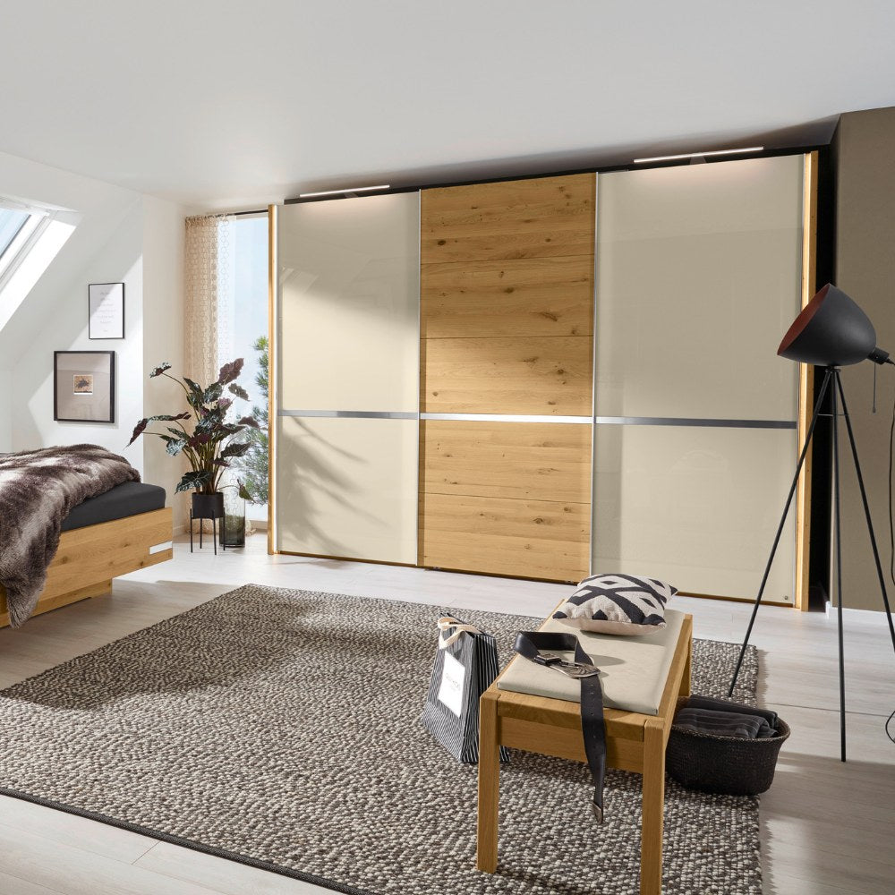 - Option 2: Zwei äußere Schiebetüren mit Spiegel- oder Glasfront und eine mittlere Tür aus Eiche.