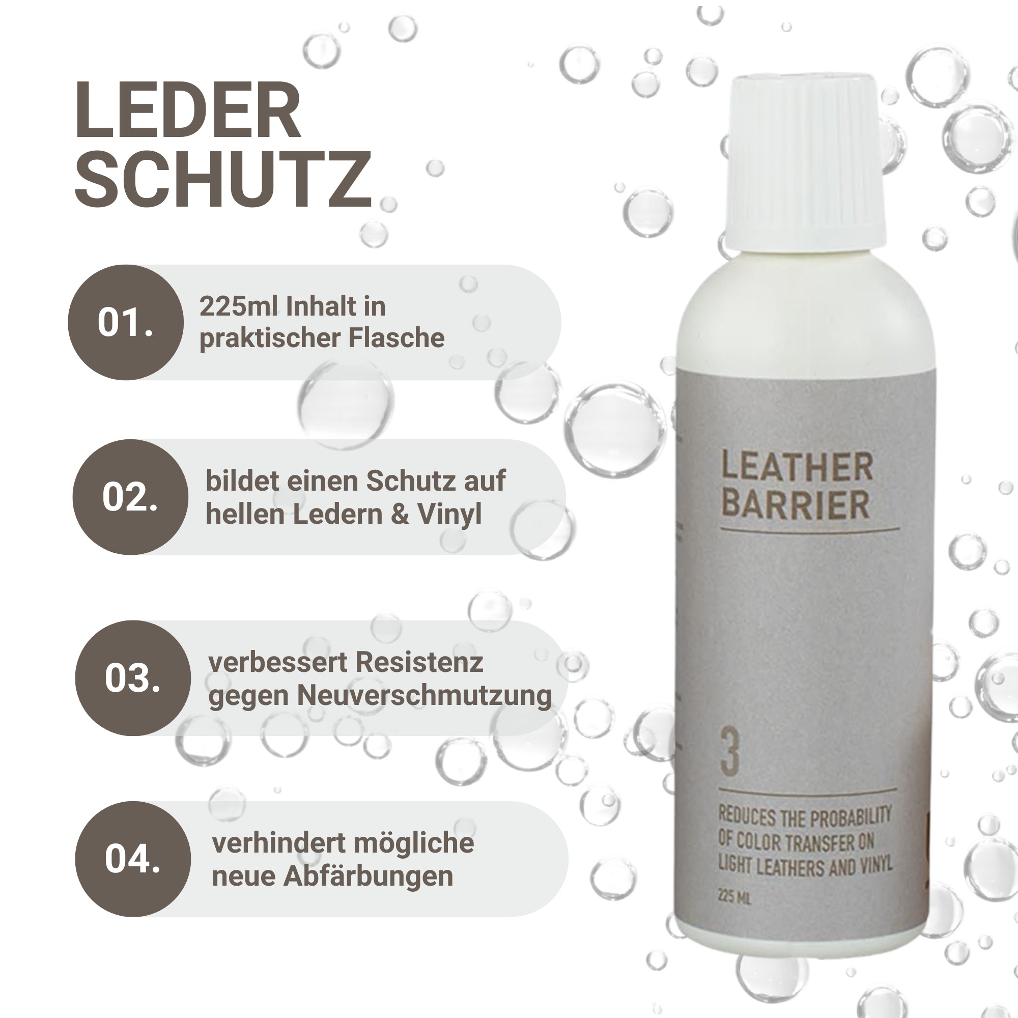 Die Leather Barrier Creme verringert die Wahrscheinlichkeit einer neuen Farbübertragung auf helles Leder und bietet einen allgemeinen Schutz vor Schmutz und Flecken. Auf dunklen Ledern sollte das Set nicht angewendet werden.