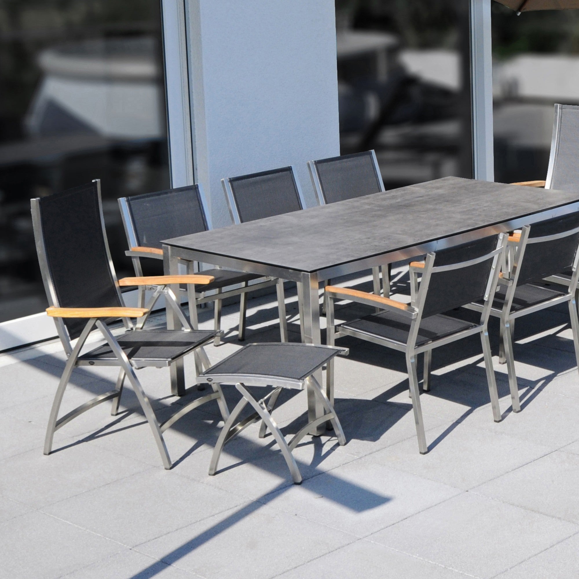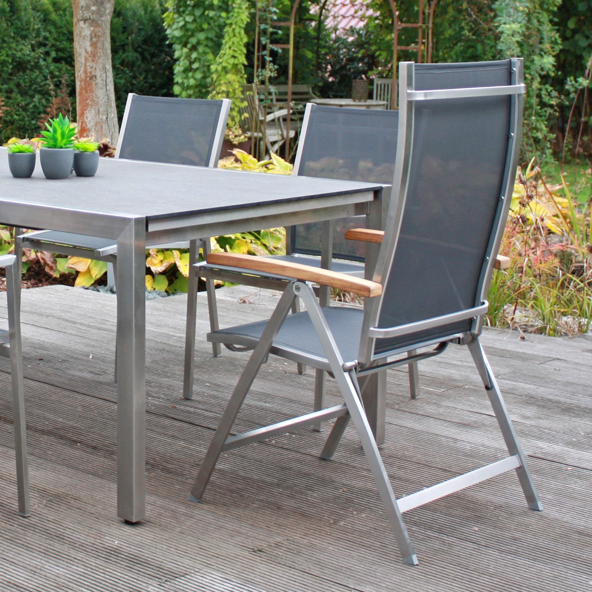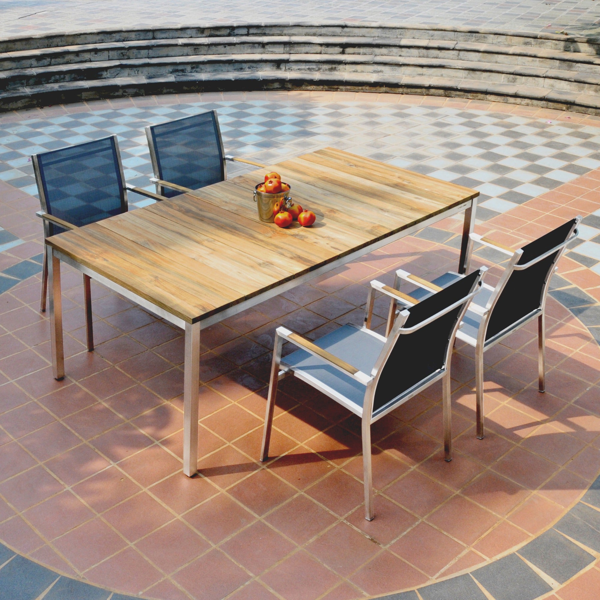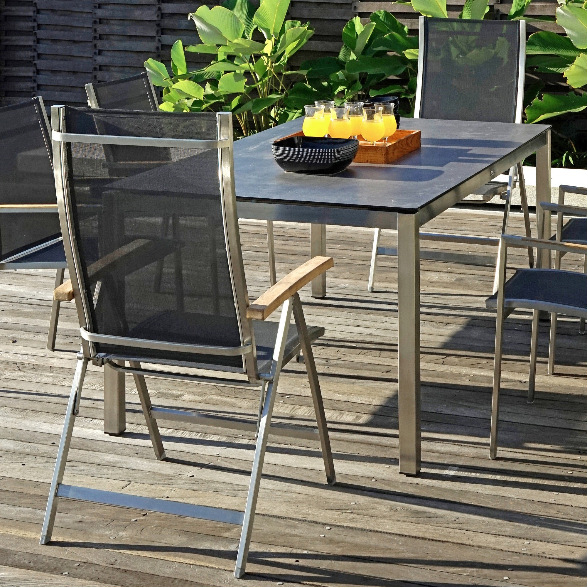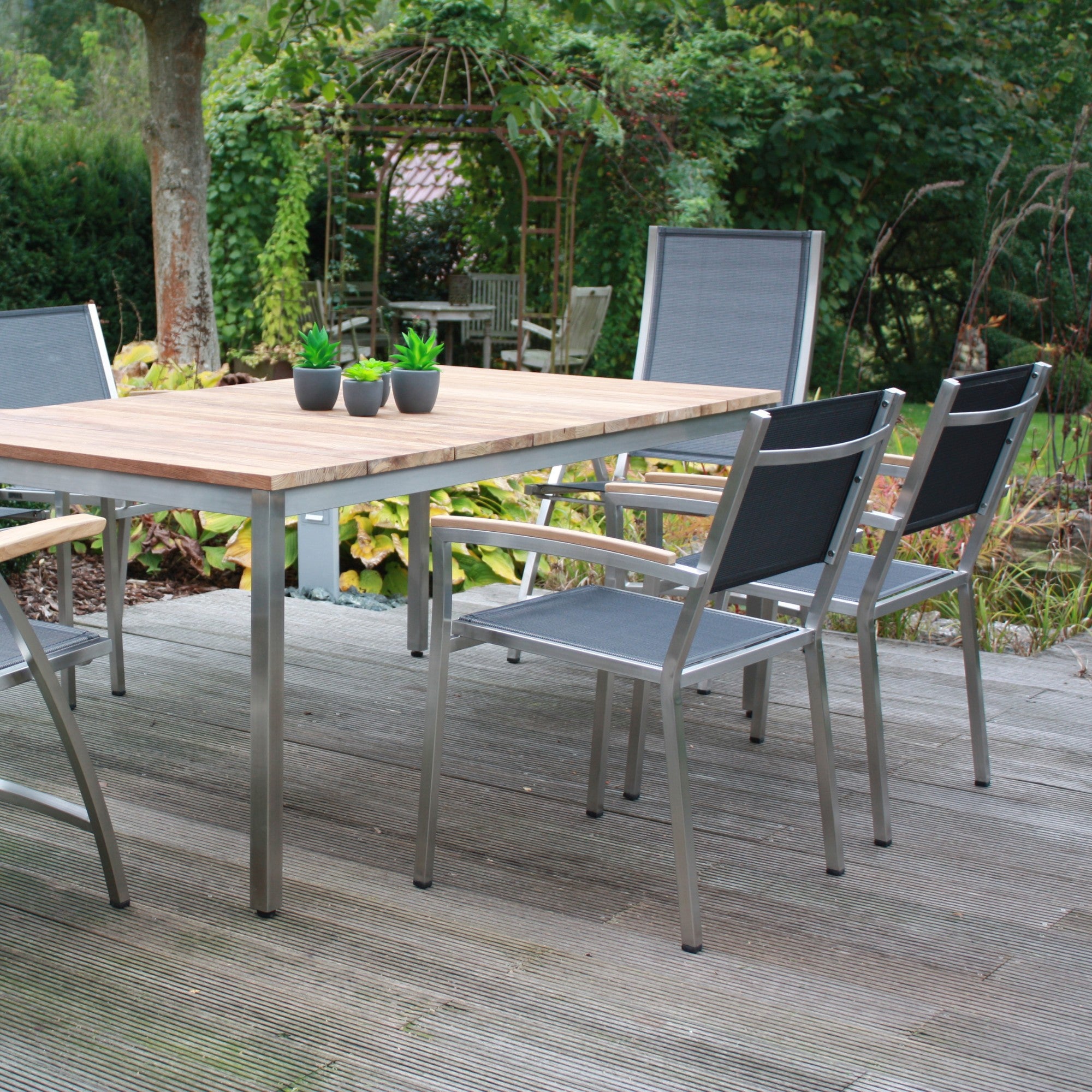 - Edelstahl- und Teakholztische für Essbereiche im Freien.
