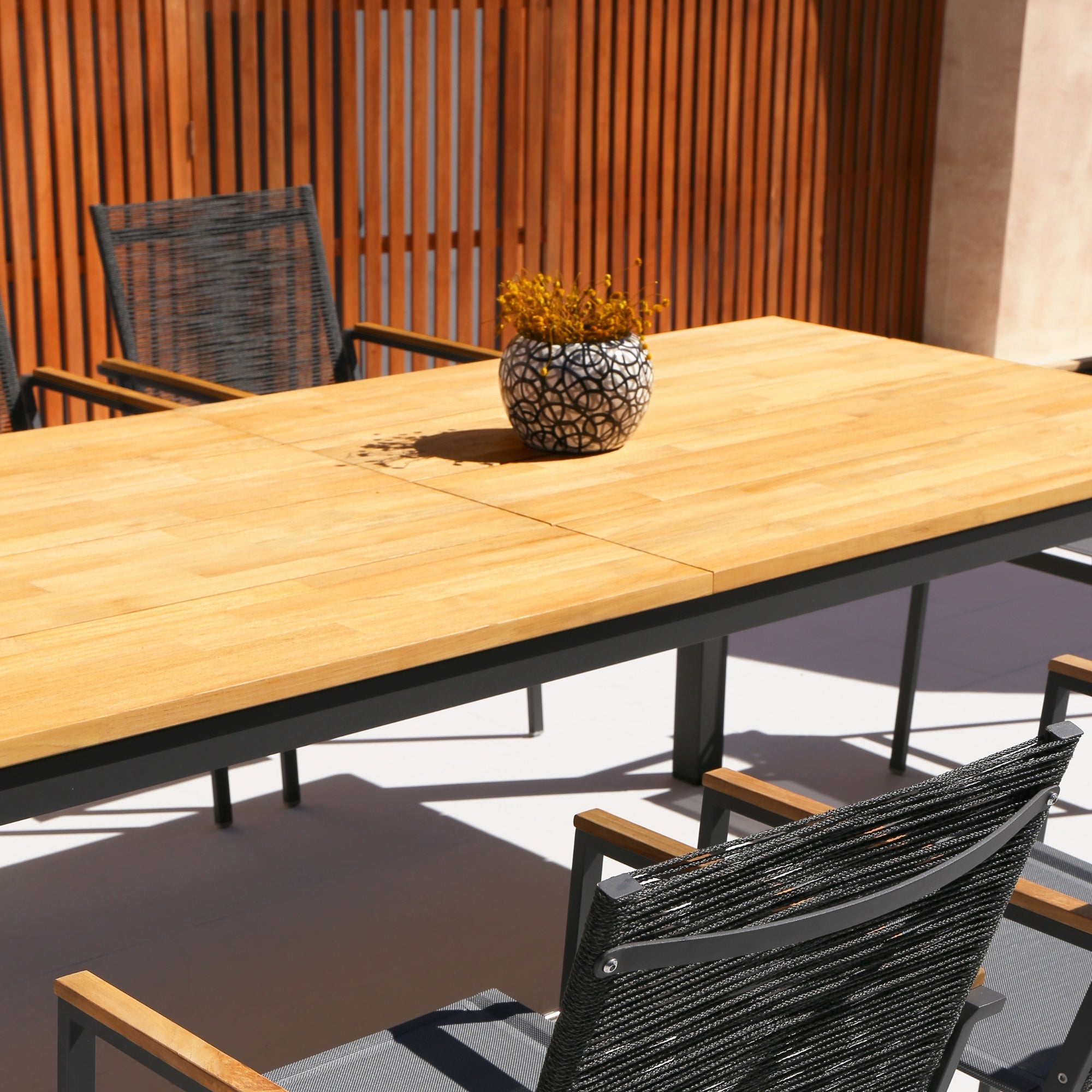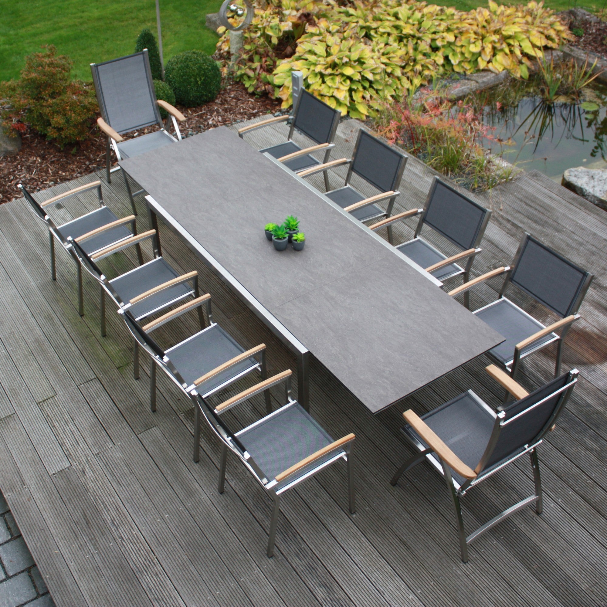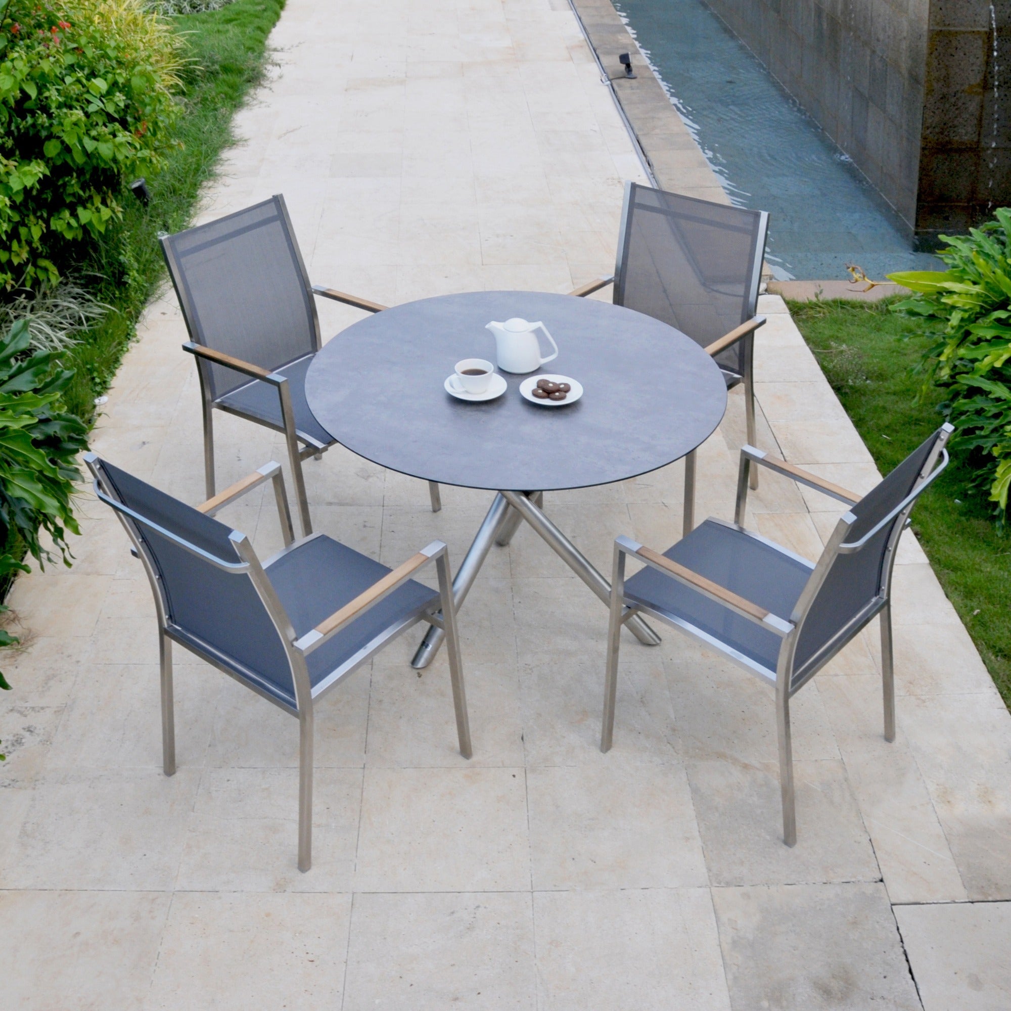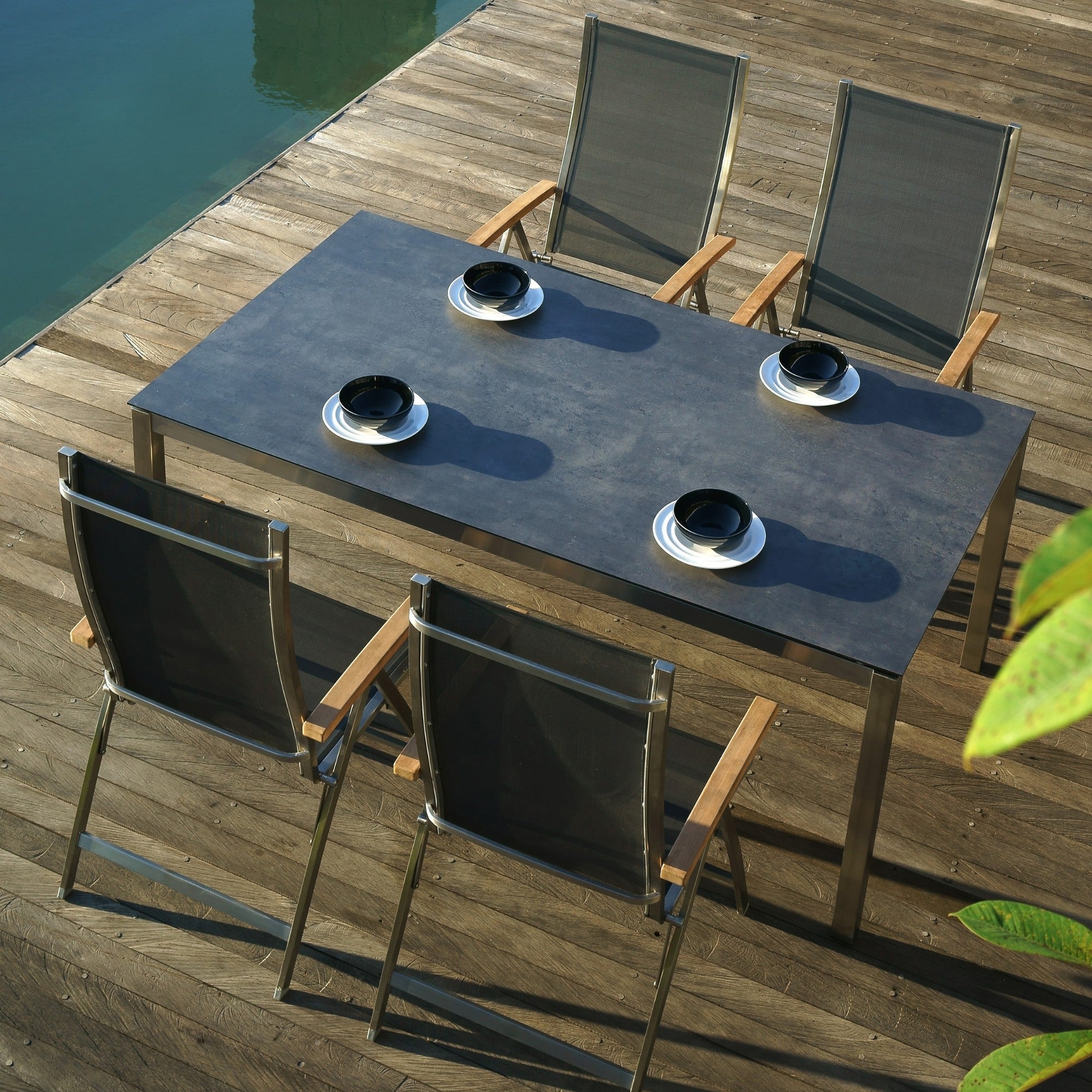 - Edelstahl- und Teakholztische für Essbereiche im Freien.