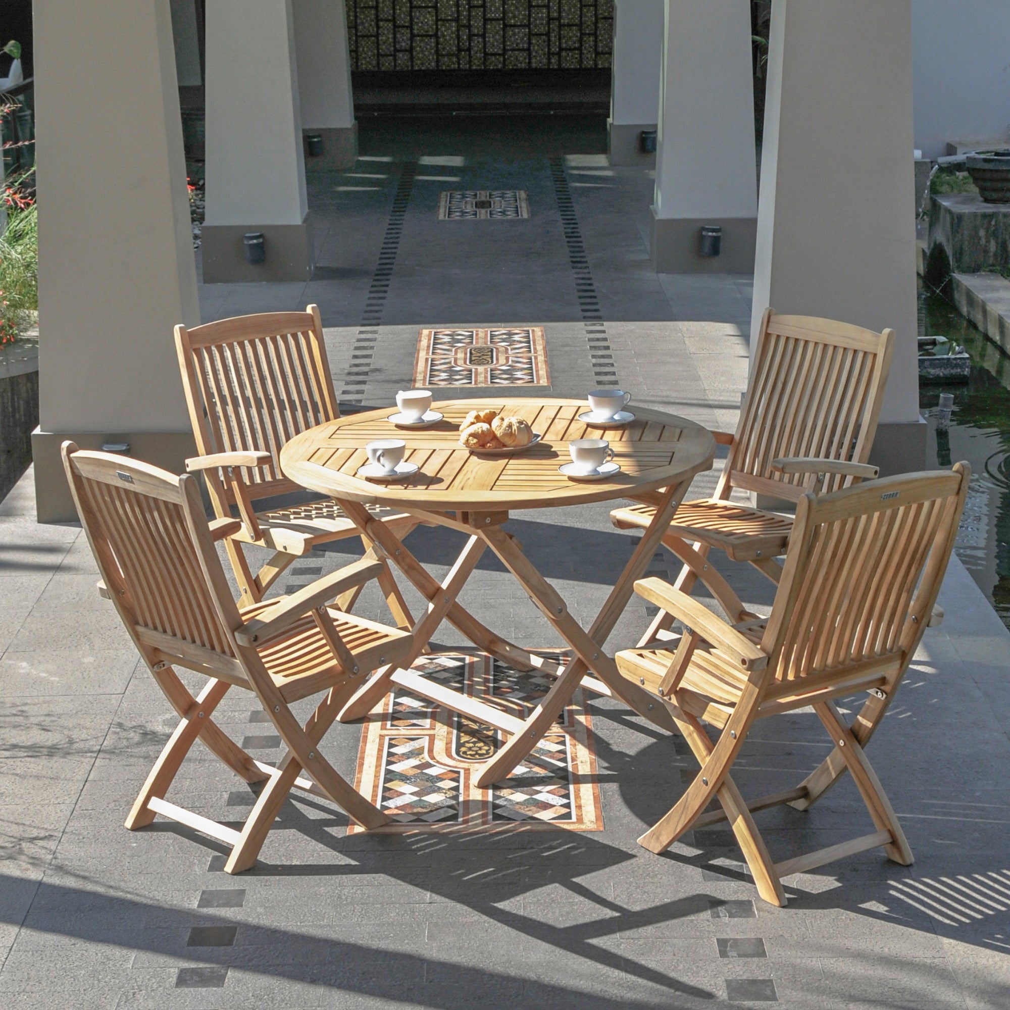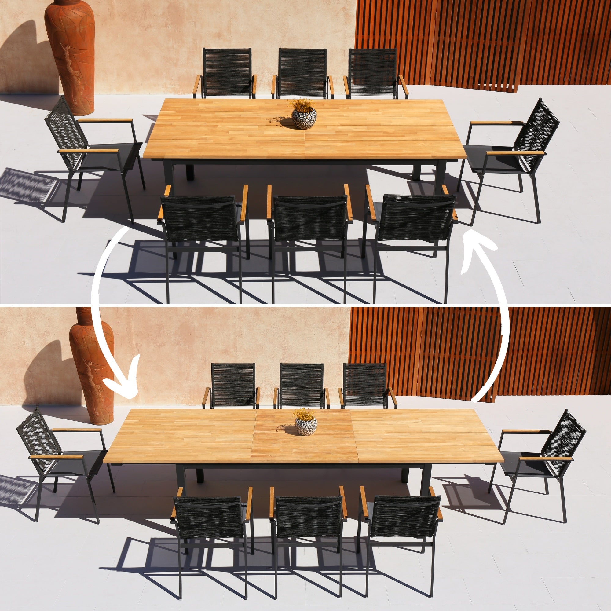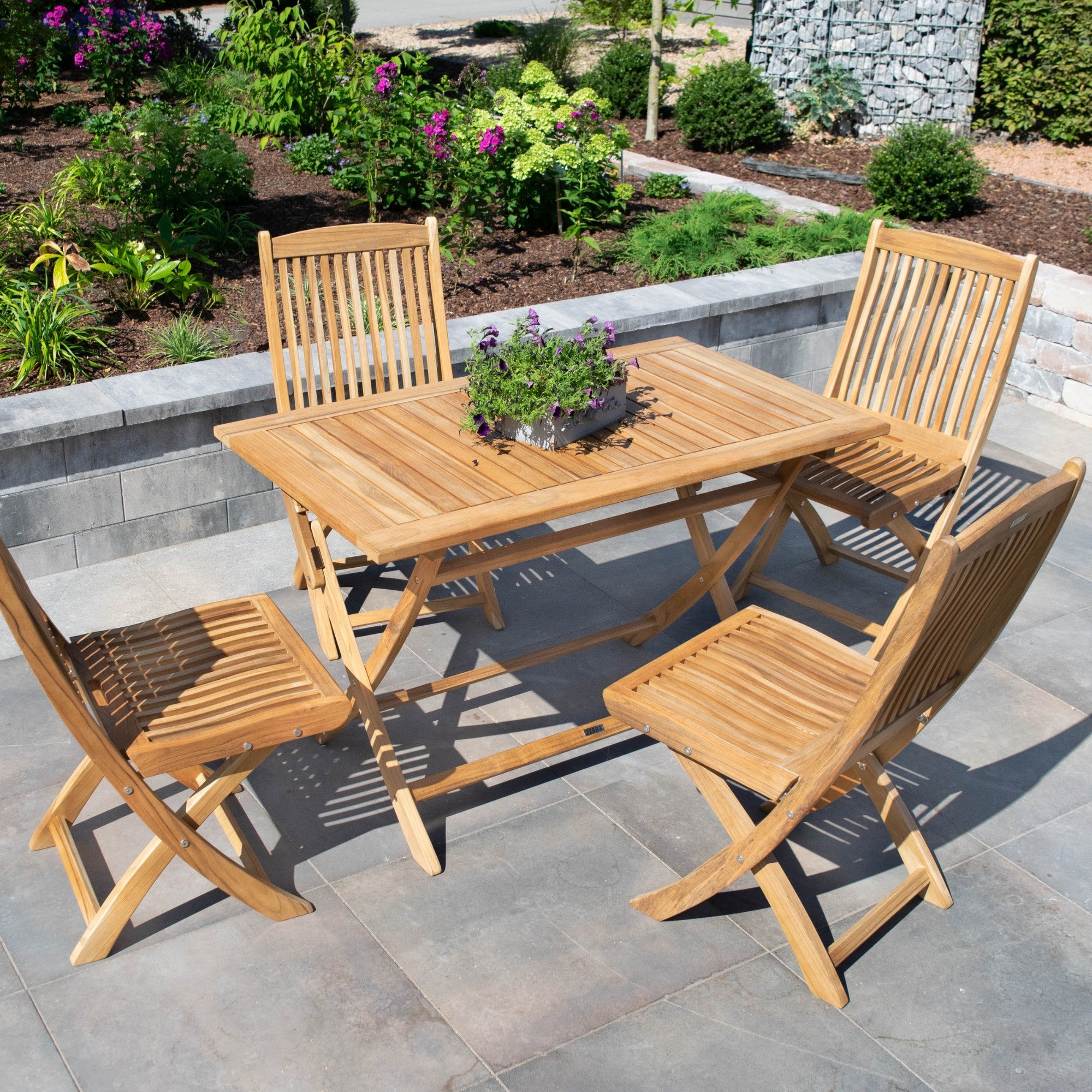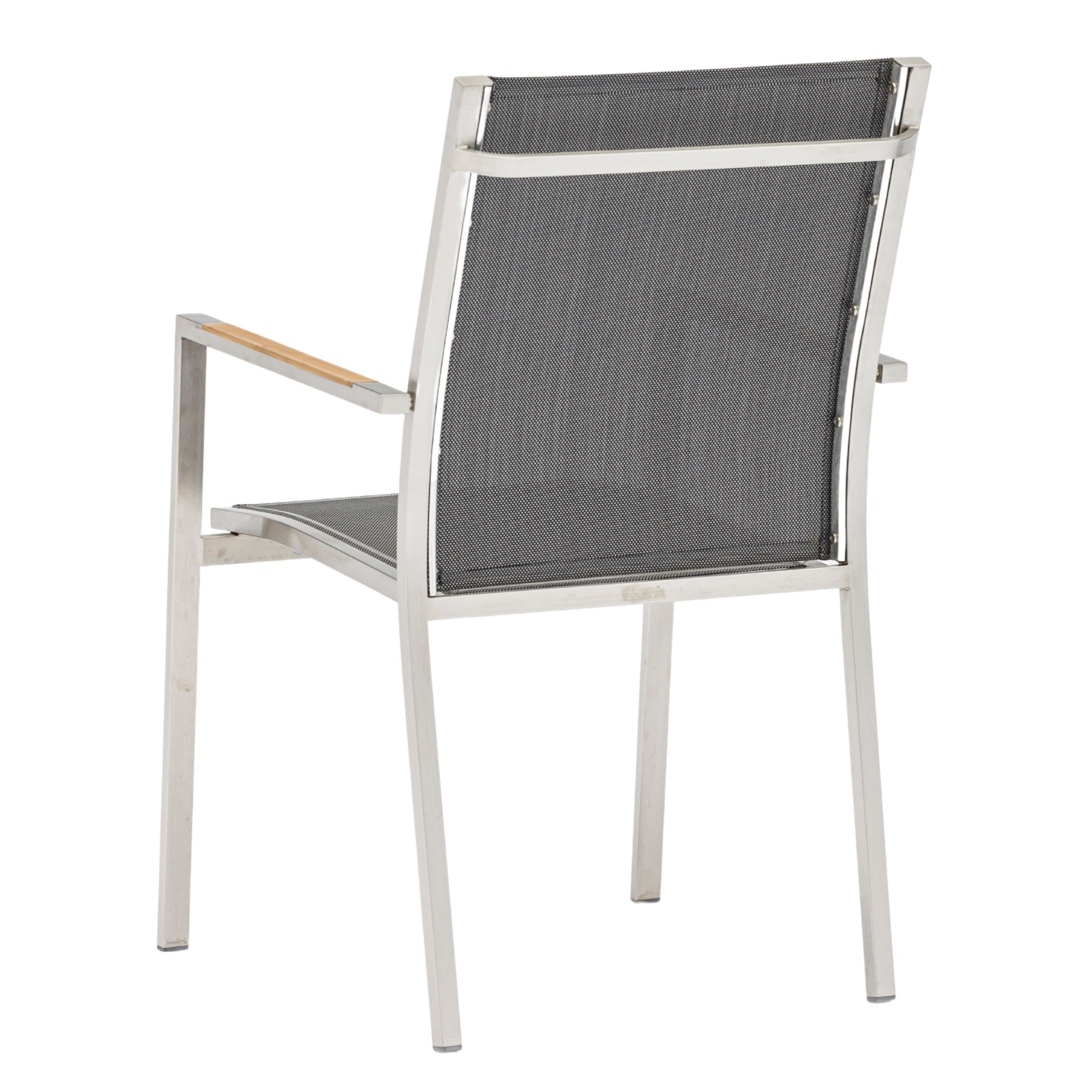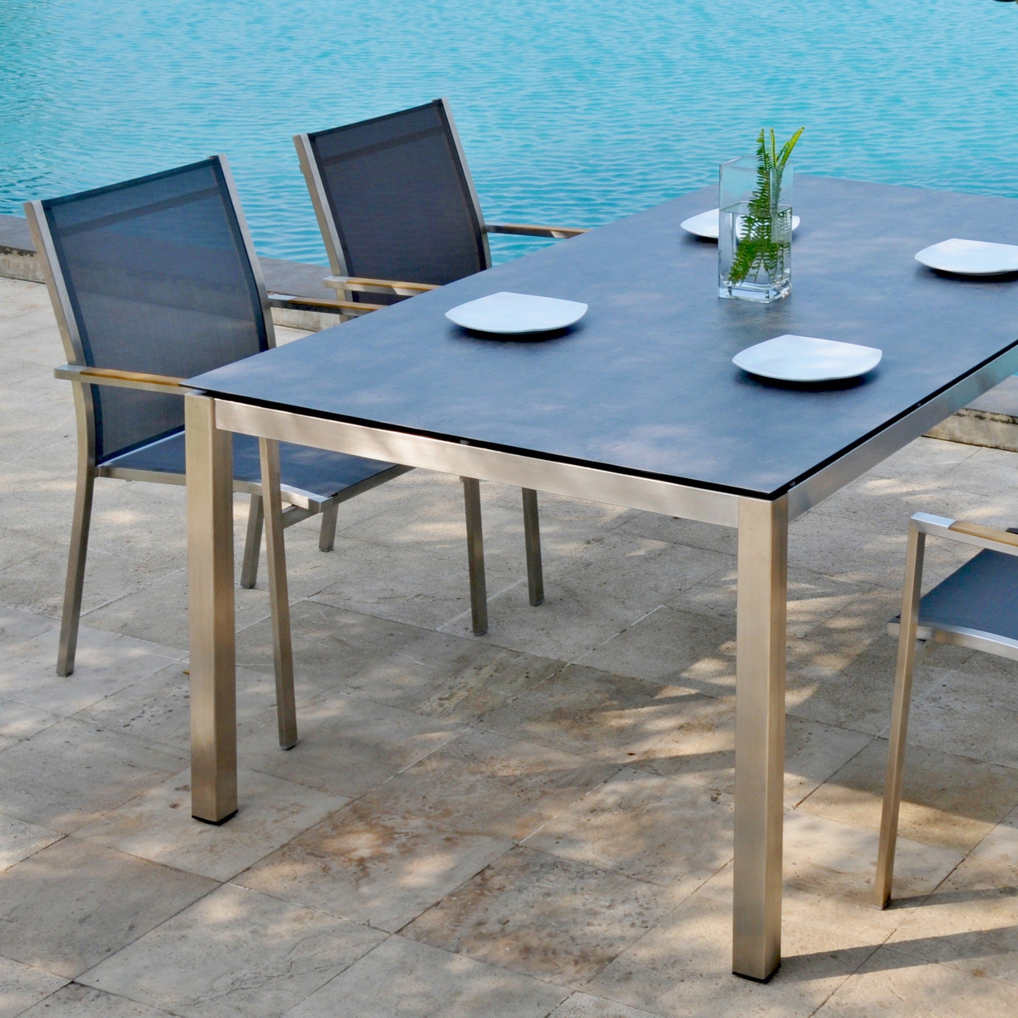 - Edelstahl- und Teakholztische für Essbereiche im Freien.