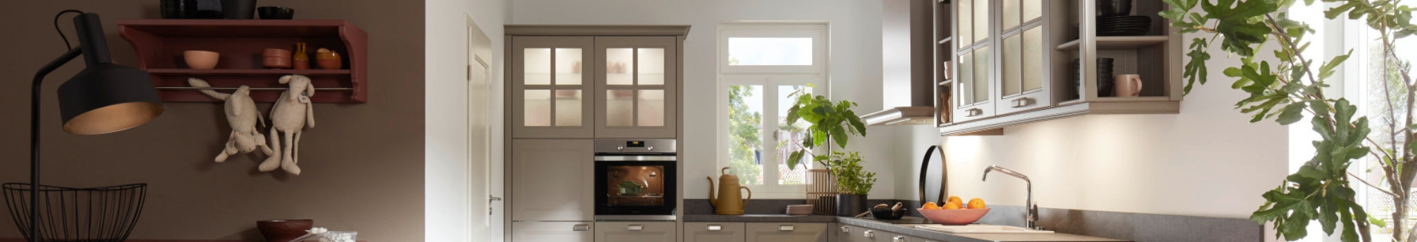 Schränke, Schranktüren und Schubladen- & Küchenfronten in einer Landhausküche sind oft mit profilierten oder gefrästen Details versehen. Glasscheiben in den Oberschränken, oft mit Sprossen, sind ebenfalls typisch. Diese Elemente verleihen der Küche eine nostalgische Note.
