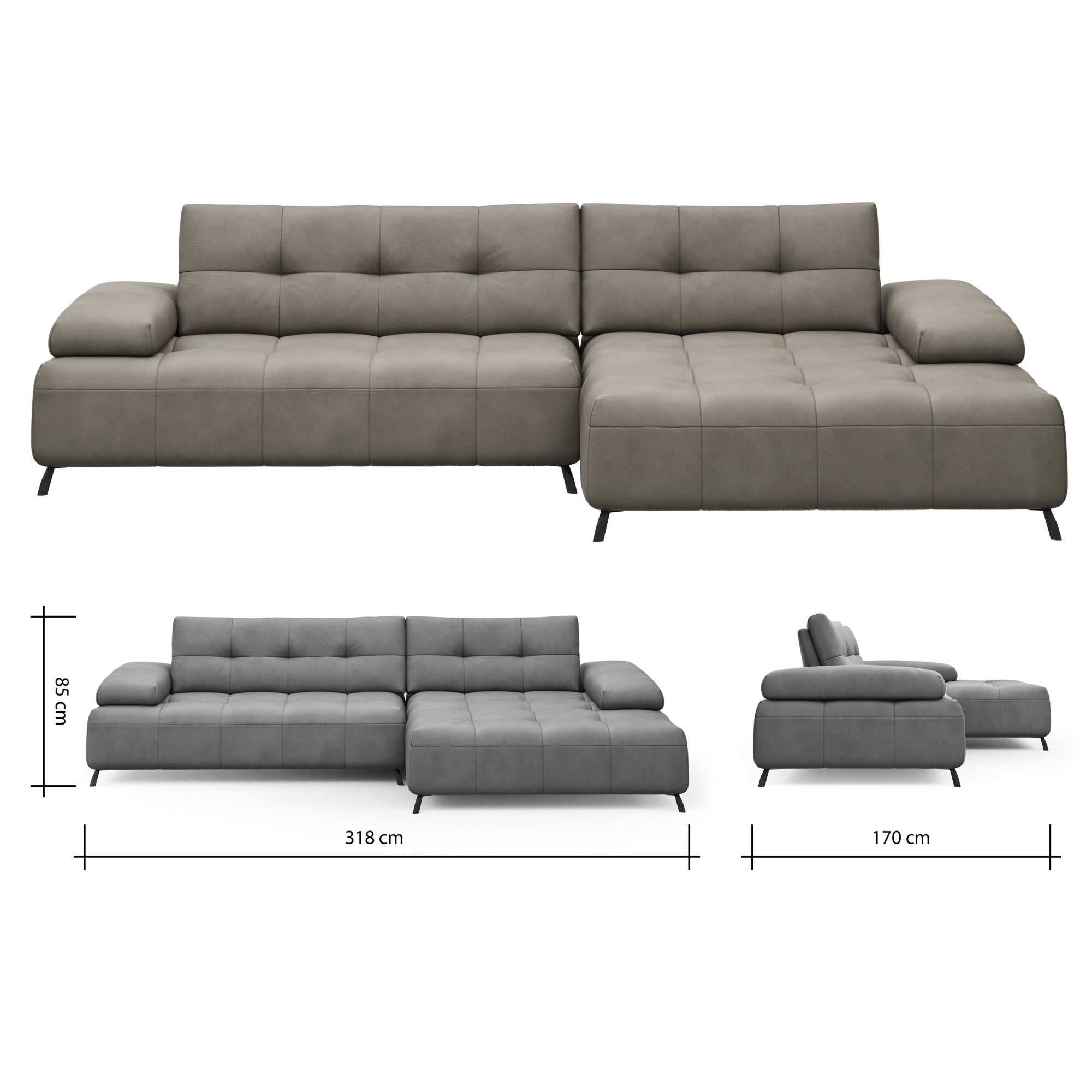 Mit einer Breite von 318 cm, einer Tiefe von 170 cm und einer Höhe von 85 cm bietet das Ecksofa ausreichend Platz für gemütliche Abende mit Freunden oder der Familie. Es ist der ideale Begleiter für jeden Raum und fügt sich nahtlos in Ihre bestehende Einrichtung ein.