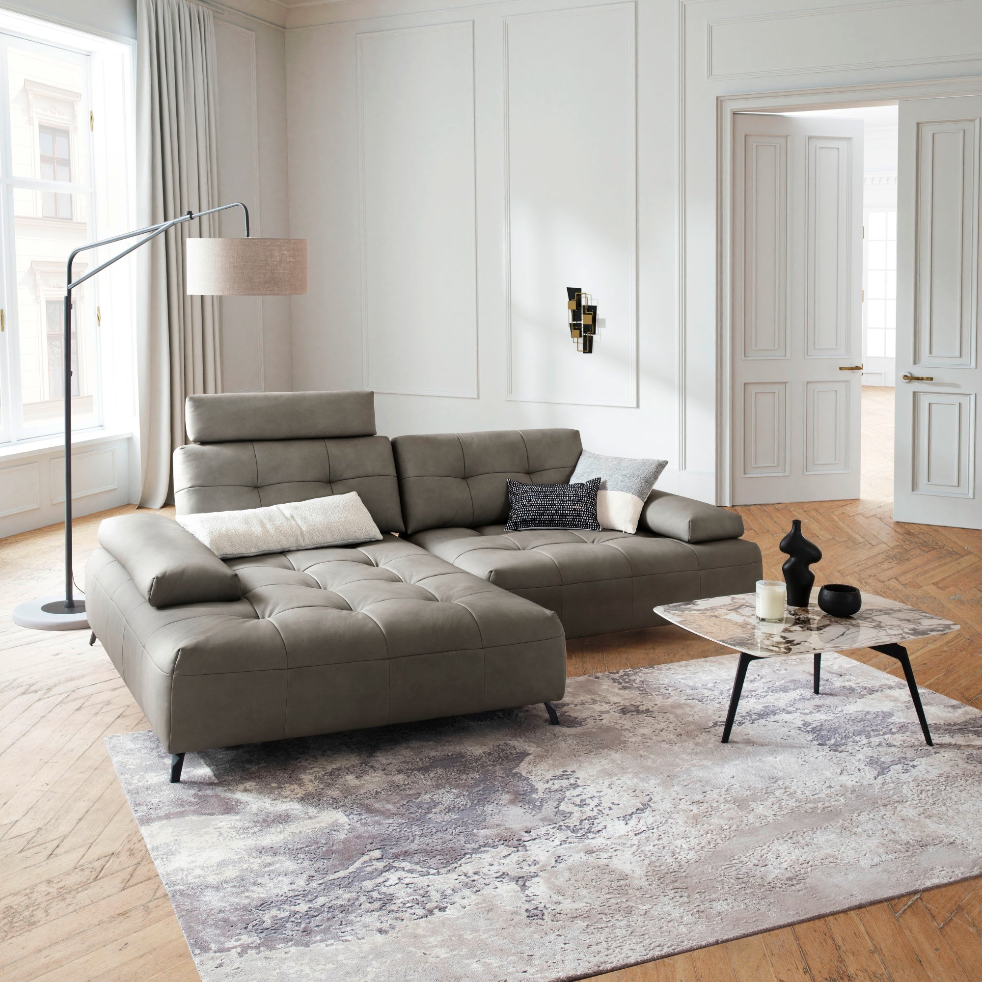 Contur Ecksofa Comodo mit Longchair, 1,5-Sitzer, Lederbezug taupe