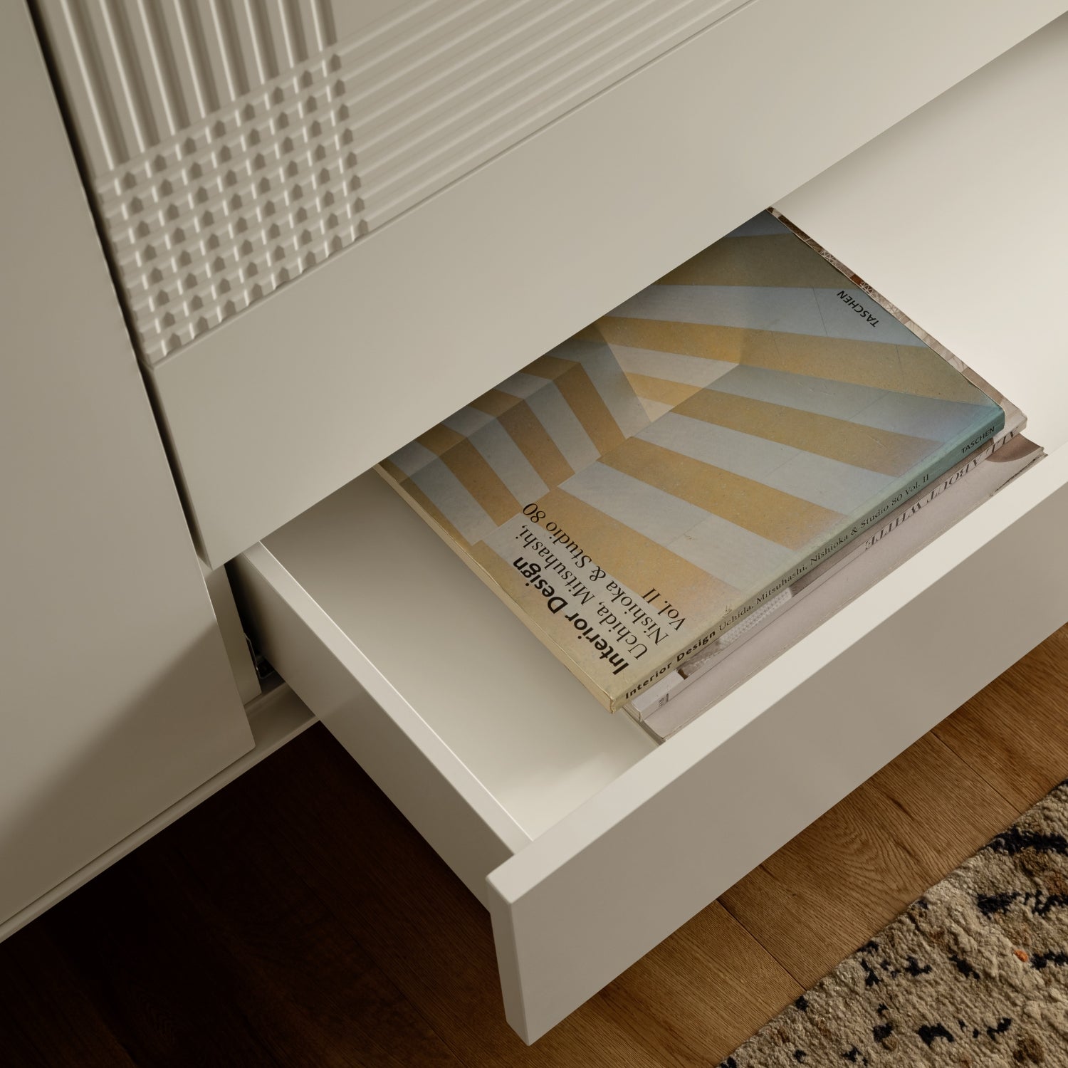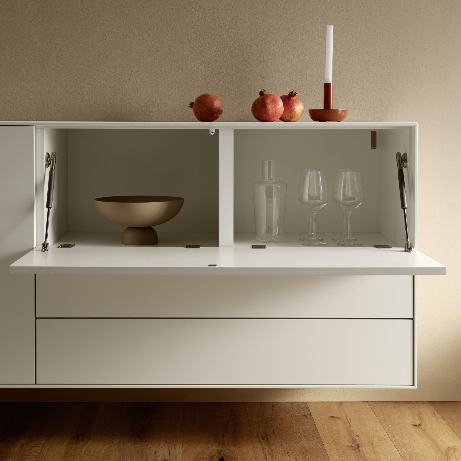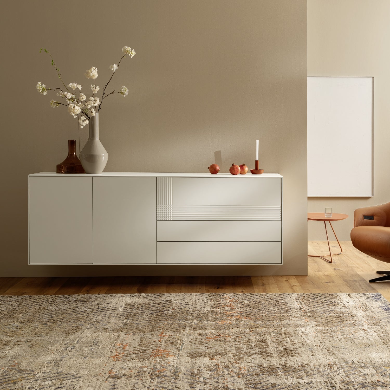 Das Sideboard Colore bietet eine durchdachte Innenaufteilung: Es verfügt über zwei Türen, eine Klappe und zwei Schubladen, die ausreichend Platz für alltägliche Gegenstände, dekorative Accessoires oder wichtige Dokumente bieten. Die wandhängende Ausführung des Möbelstücks verleiht dem Raum eine leichte und schwebende Ästhetik, die perfekt zu modernen Wohntrends passt.