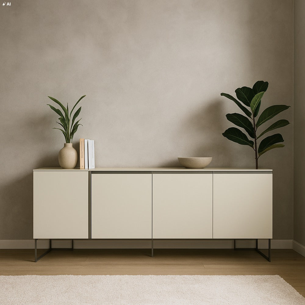 Hinter den vier sorgfältig verarbeiteten Türen verbirgt sich ein durchdachtes Stauraumsystem mit zwei Einlegeböden, das Ihnen flexible Gestaltungsmöglichkeiten für Geschirr, Bücher, Dekoration oder persönliche Gegenstände bietet. Die hochwertigen Metallfüße in eckiger Form sorgen nicht nur für eine stabile Standfläche, sondern verleihen dem Sideboard auch eine luftige Optik durch die 20 cm Bodenfreiheit – ein Detail, das die Reinigung erleichtert und den Raum optisch größer wirken lässt.