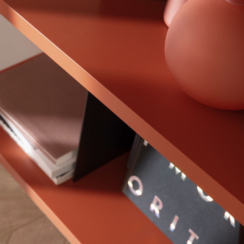 Die großzügigen Dimensionen bieten reichlich Raum für Ihre persönlichen Schätze – von der liebgewonnenen Buchsammlung über dekorative Akzente bis hin zu alltäglichen Gegenständen, die stilvoll in Szene gesetzt werden möchten. Die moderne Farbkombination aus Anthrazit und Terracotta verleiht jedem Raum eine warme, zeitgemäße Ausstrahlung und fügt sich harmonisch in verschiedenste Einrichtungsstile ein.