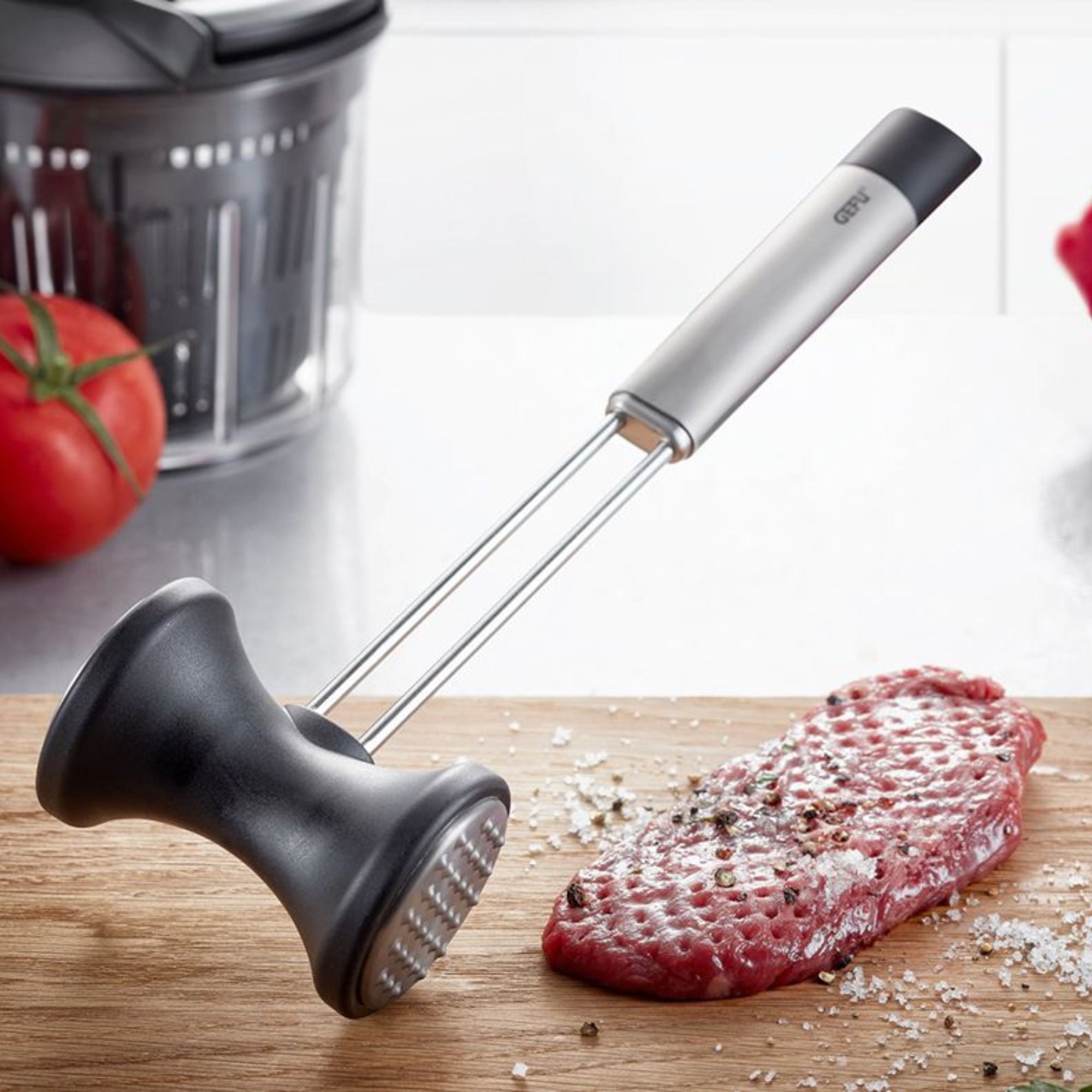 Wenn Schnitzel plattiert oder für das Rindercarpaccio hauchdünne Fleischscheiben benötigt werden, übernimmt das der gut in der Hand liegende Fleischklopfer.Herstellerinformation: GEFU GmbH, Braukweg 28, D-59889 Eslohe, info@gefu.com