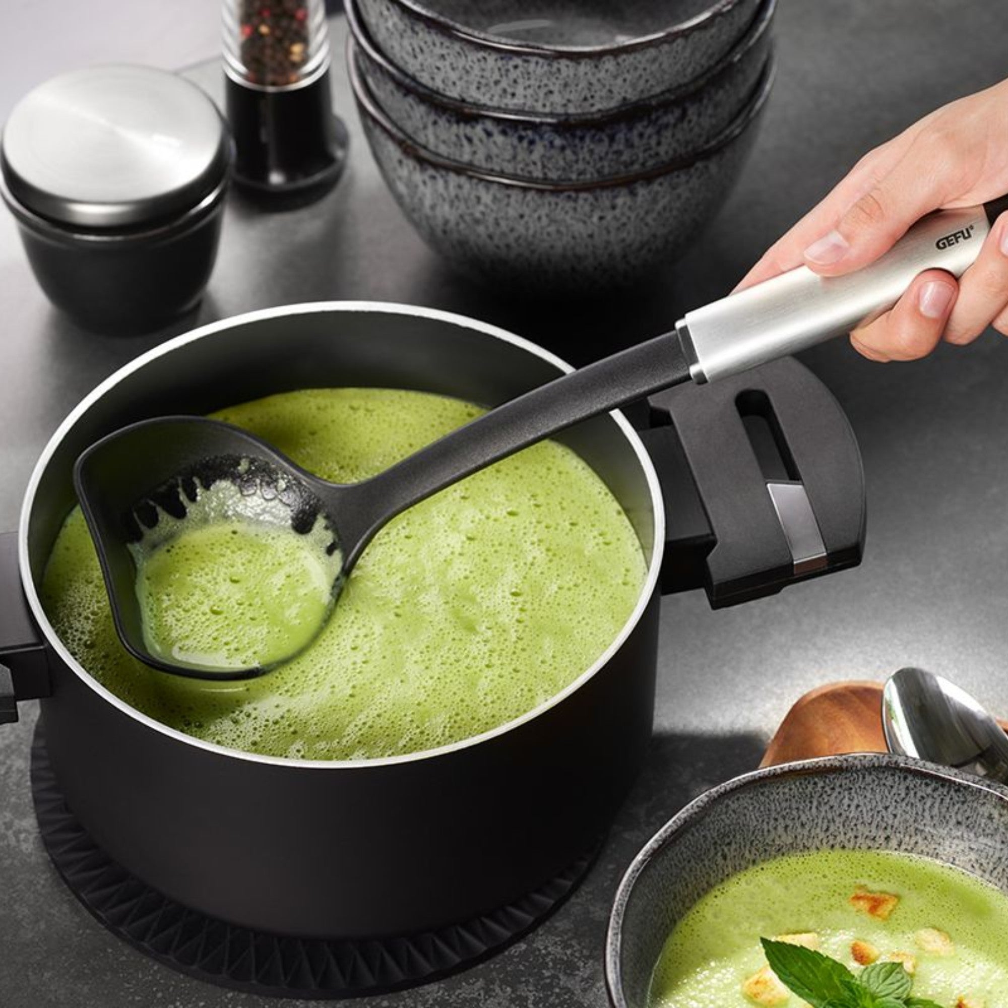 Die Kelle des Schöpflöffels aus Nylon ist insbesondere bei beschichteten Kochgeschirren ideal: Werden Suppen, Saucen, halbflüssige Teige & Co. portioniert, hinterlässt die Kelle keine Kratzer in Töpfen, Pfannen und Schüsseln.Herstellerinformation: GEFU GmbH, Braukweg 28, D-59889 Eslohe, info@gefu.com