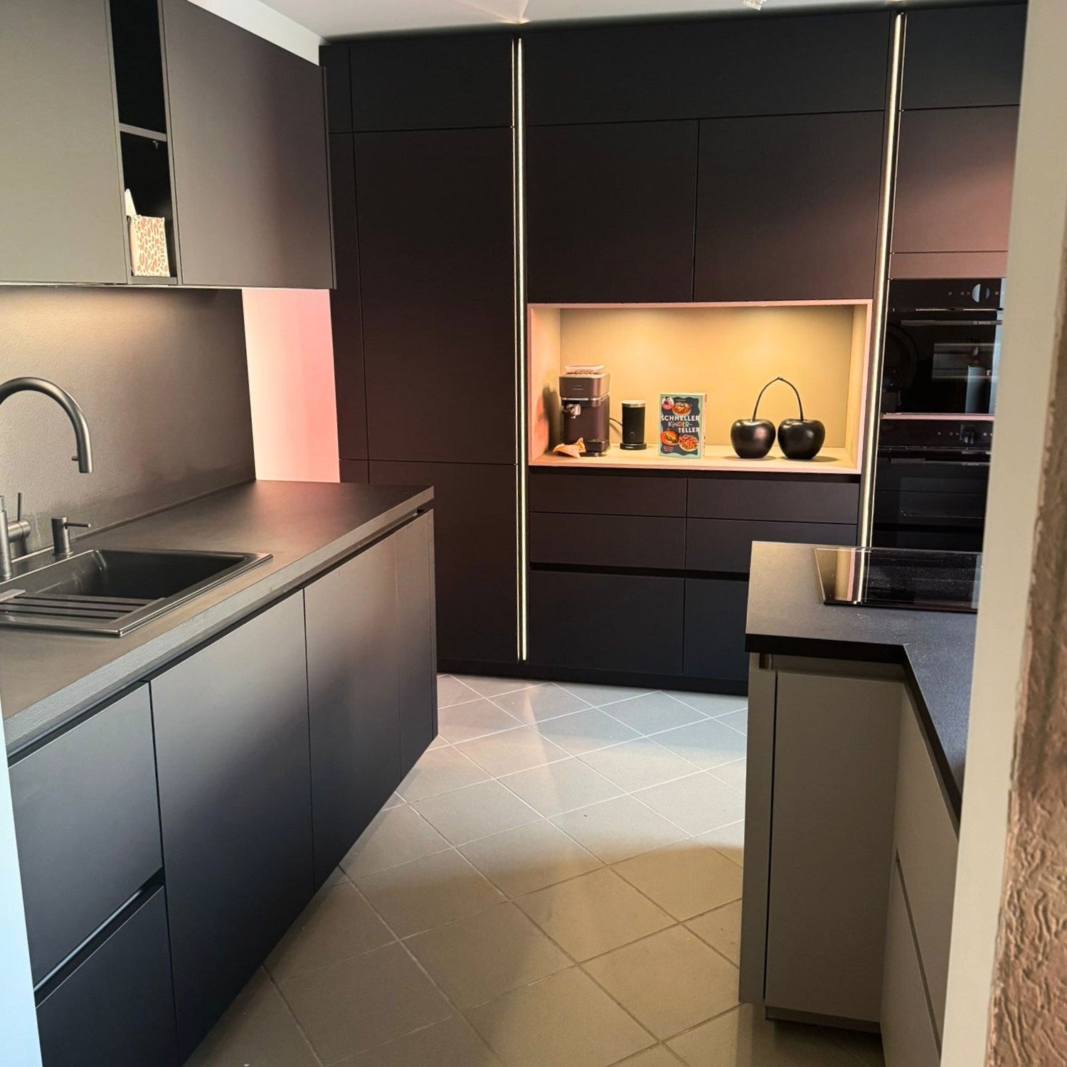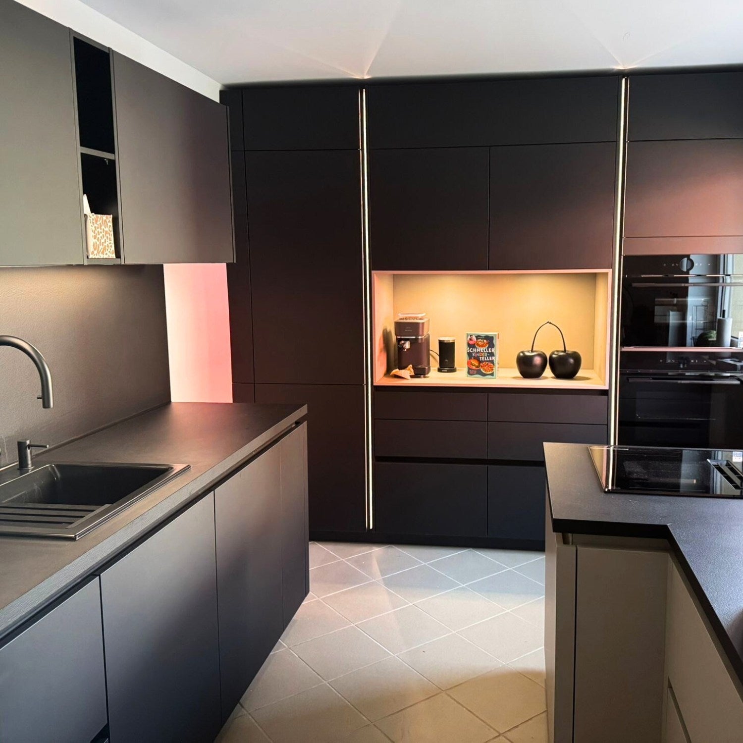 Die Grundlage dieser Küche bildet das hochwertige Nolte-Küchensystem. Die Fronten in PLUS P14 Lava softmatt kombiniert mit schwarzen softmatten Akzenten verleihen der Küche eine moderne und professionelle Ausstrahlung.