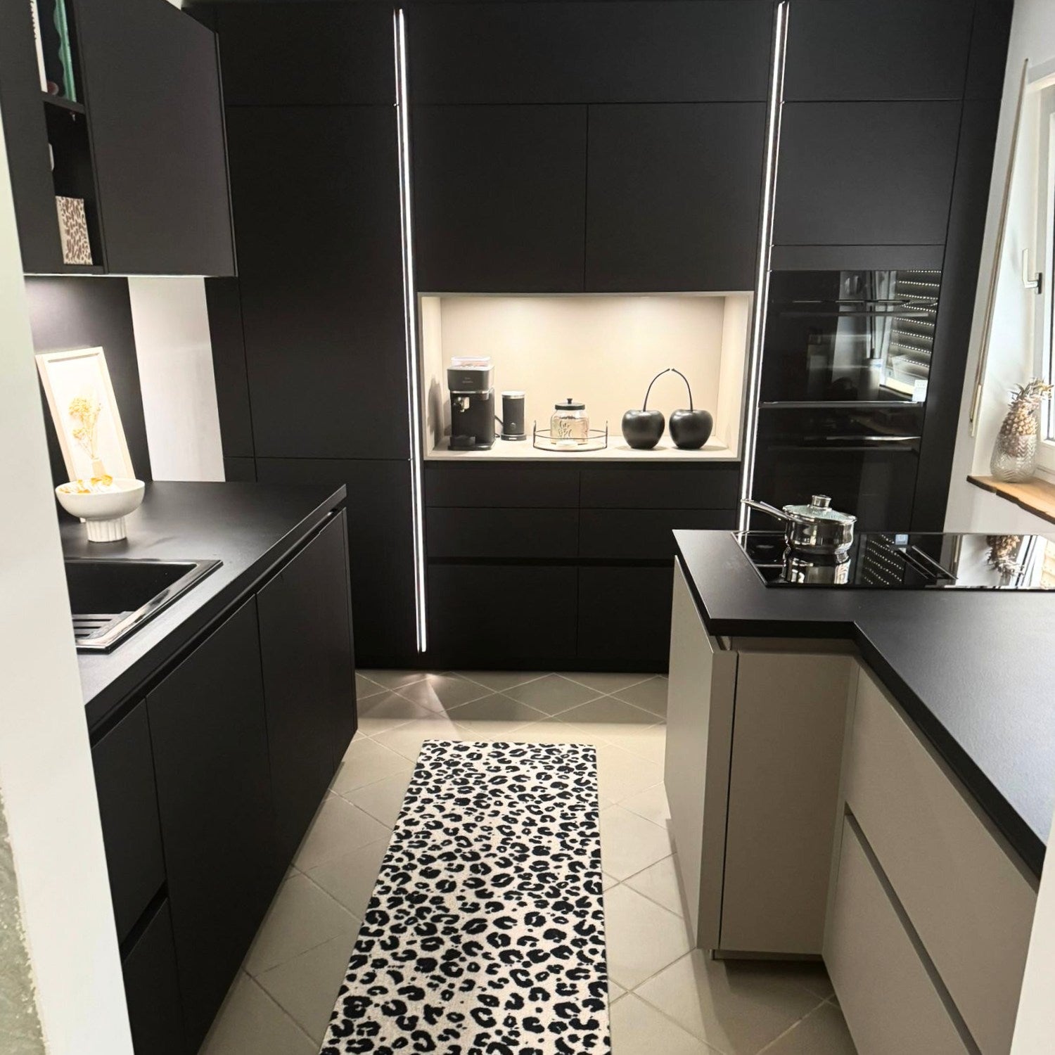 Das Zentrum der Küche ist die robuste 40 mm APD-Arbeitsplatte mit Dickkante in Schwarz PRO. Sie bietet eine widerstandsfähige und elegante Oberfläche, die den intensiven Anforderungen eines Food-Bloggers gewachsen ist.