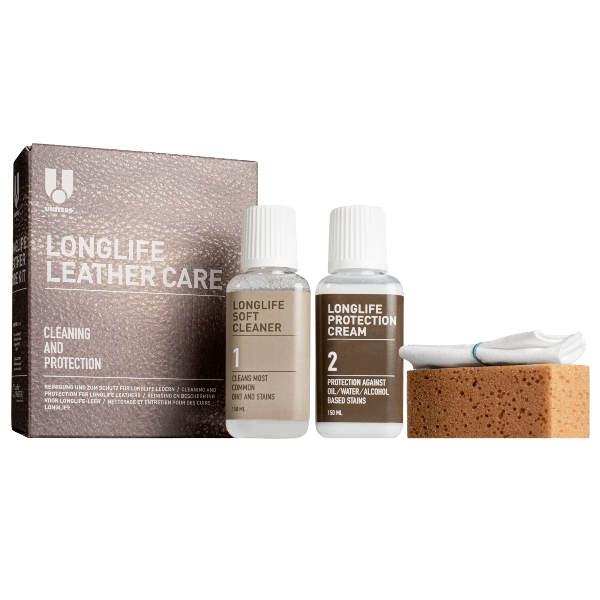 Mit dem LongLife Leather Care-Kit reinigen und schützen Sie Ihre Ledermöbel optimal. Der spezielle Lederreiniger (LongLife Soft Cleaner) wird auf Wasserbasis hergestellt und kann in feine Strukturen des Leders eindringen und reinigen, ohne diese zu schädigen. Um einen langen, neuwertigen Look beizubehalten und das Leder vor Flecken, Abnutzungen und Aushärten zu bewahren, schafft im Anschluss an den Reiniger die Pflege-Creme (LongLife Protection Cream) Abhilfe.