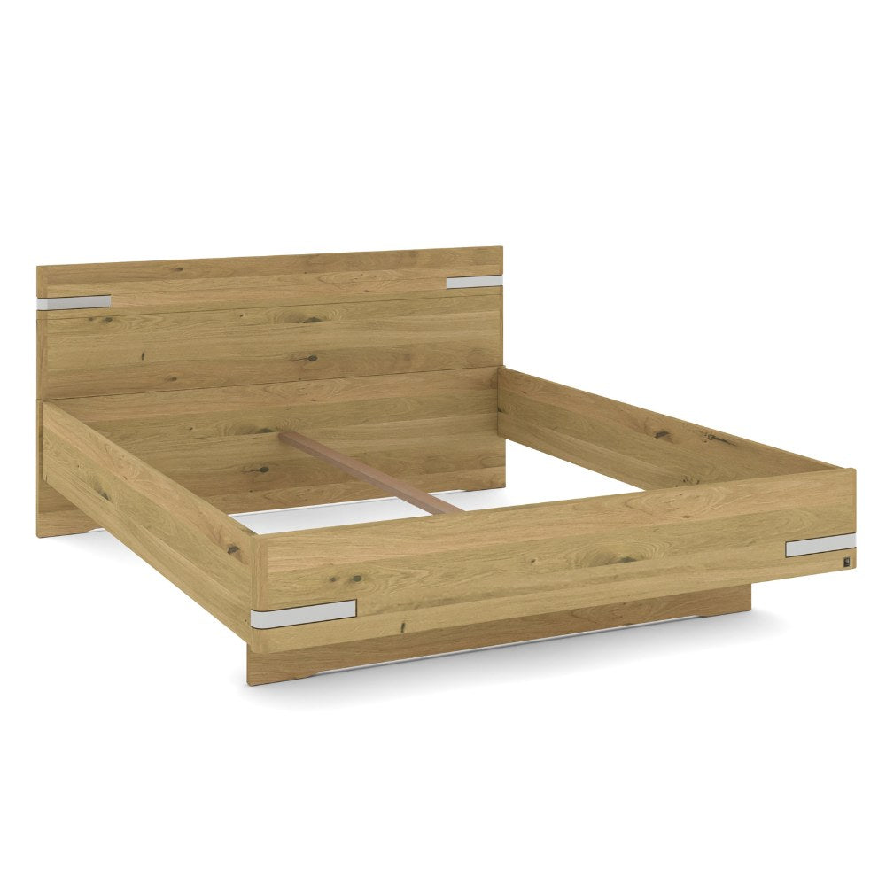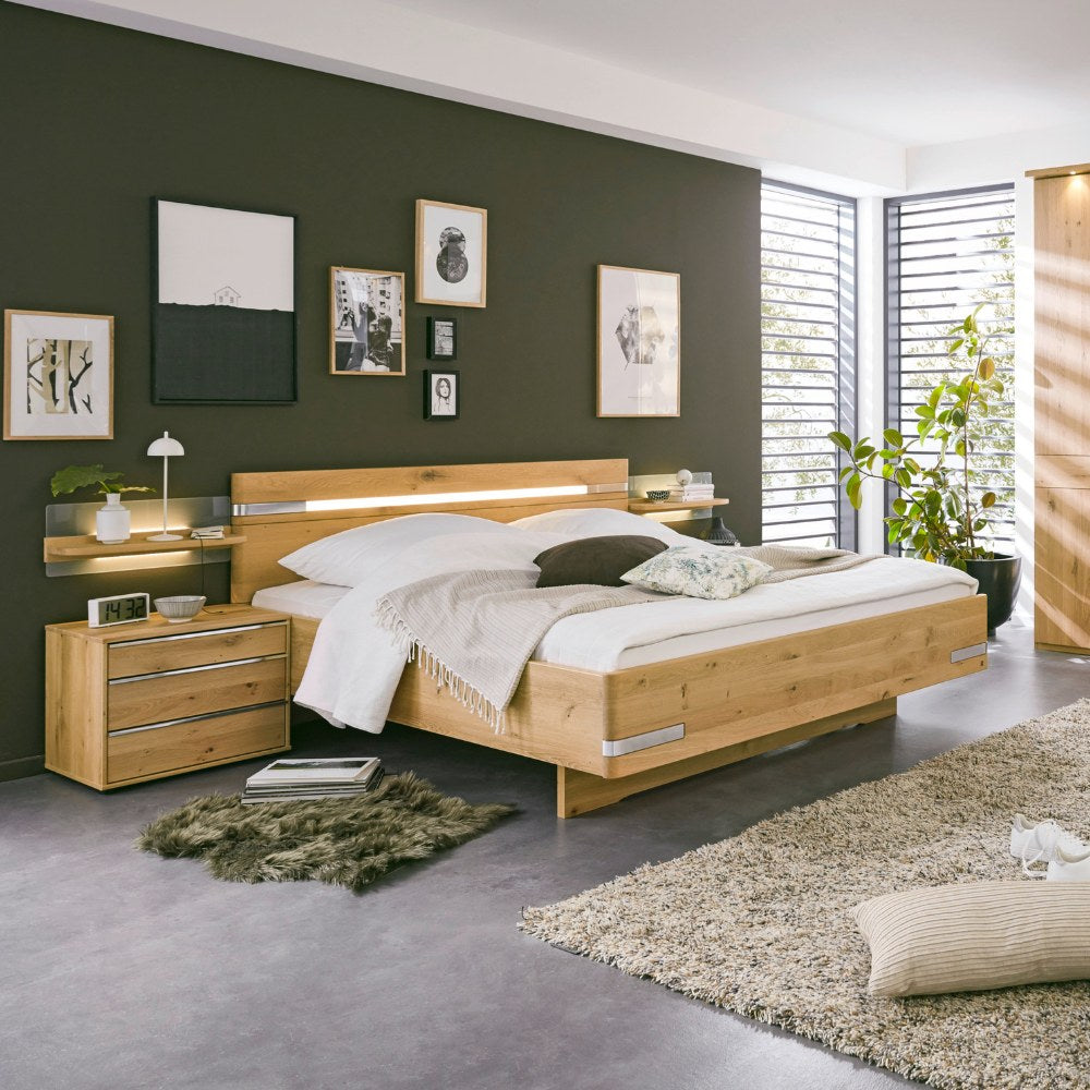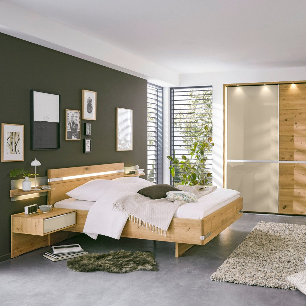 Die sorgfältig verarbeiteten Massivholzfronten entfalten eine natürliche Aura, die den Schlafraum in einen Ort der Ruhe und Balance verwandelt. Stilvolle Chromleisten verleihen dem Design einen edlen Akzent von zeitloser Eleganz. Das optional wählbare Kopfteil, erhältlich in massivem Bianco-Eiche-Holz oder als Polsterkopfteil in Kunstleder Champagner, bietet zusätzliche Gestaltungsfreiheit und Komfort, sodass das Bett perfekt auf Ihre individuellen Wünsche abgestimmt ist.
