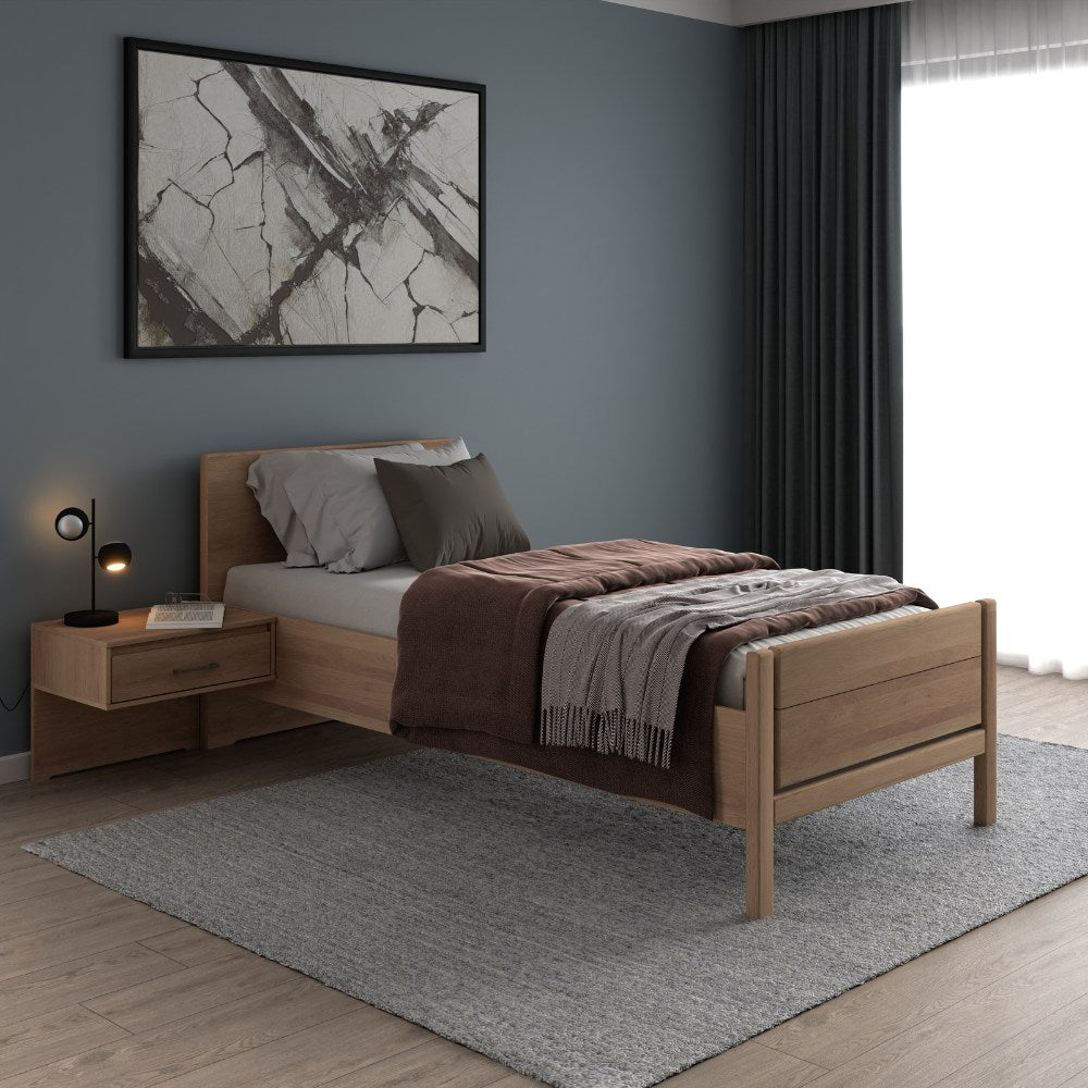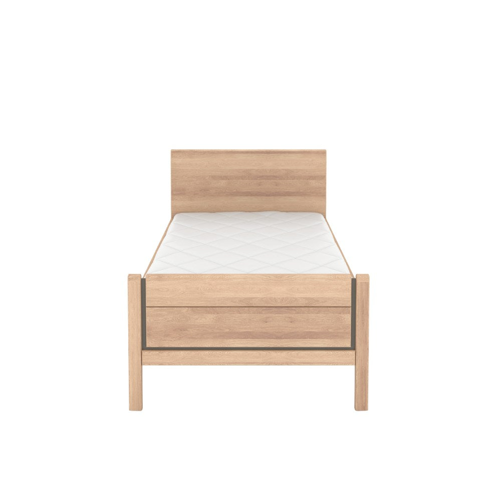 Das Einzelbett Sorrent überzeugt durch seine teilmassive Konstruktion: Kopf- und Fußteile sind aus massiver Eiche gefertigt und verleihen dem Bett seine natürliche, warme Ausstrahlung. Die Seiten- und Untergestelle in hochwertiger Eiche-Nachbildung sorgen für Stabilität und Langlebigkeit. Elegante Akzente in Schiefer-Nachbildung setzen stilvolle Kontrapunkte und unterstreichen das moderne Design.