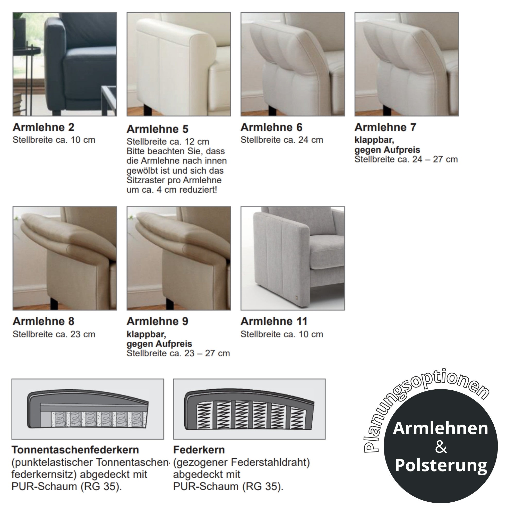 - Polsterung: Für den optimalen Sitzkomfort wählen Sie zwischen einer Polsterung mit Tonnentaschenfederkern (TTFK) und PUR-Schaum oder einer Federkernpolsterung (FK) mit PUR-Schaum.