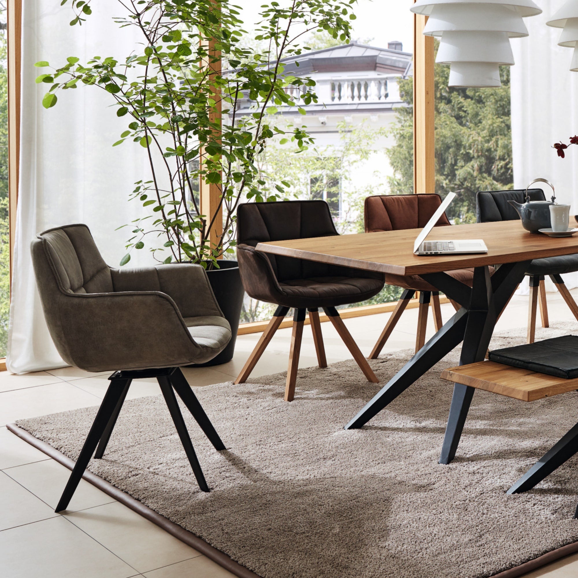 Die Armlehnstühle Tamina setzen nicht nur in Sachen Design Akzente, sondern auch durch clevere Funktionen. Die optional drehbaren Stühle mit stabilen Stativgestellen aus pulverbeschichtetem Metall oder Wildeiche bieten eine ganz neue Flexibilität und sind dabei äußerst standfest. Die Rückholfunktion sorgt dafür, dass der Stuhl immer wieder in seine Ausgangsposition zurückkehrt – perfekt für ein aufgeräumtes Erscheinungsbild.