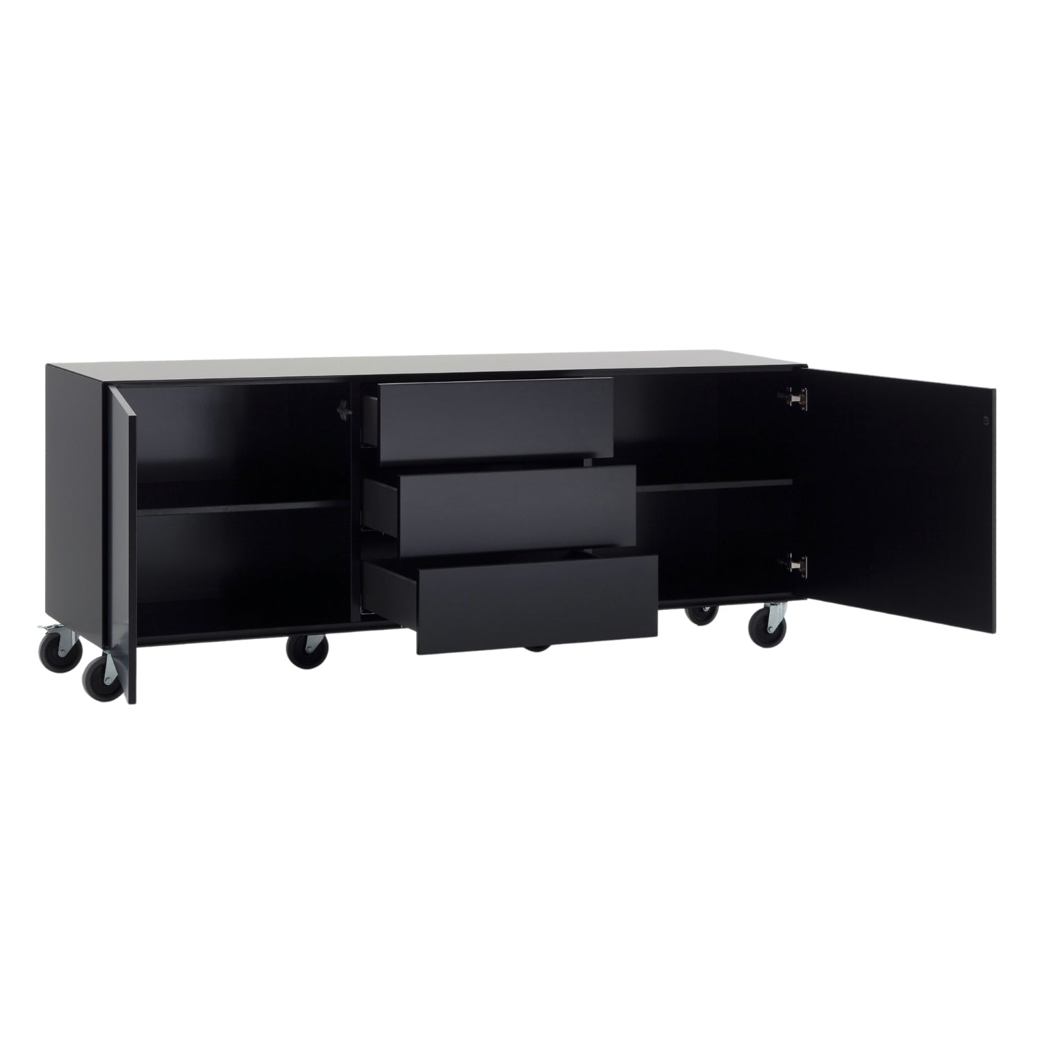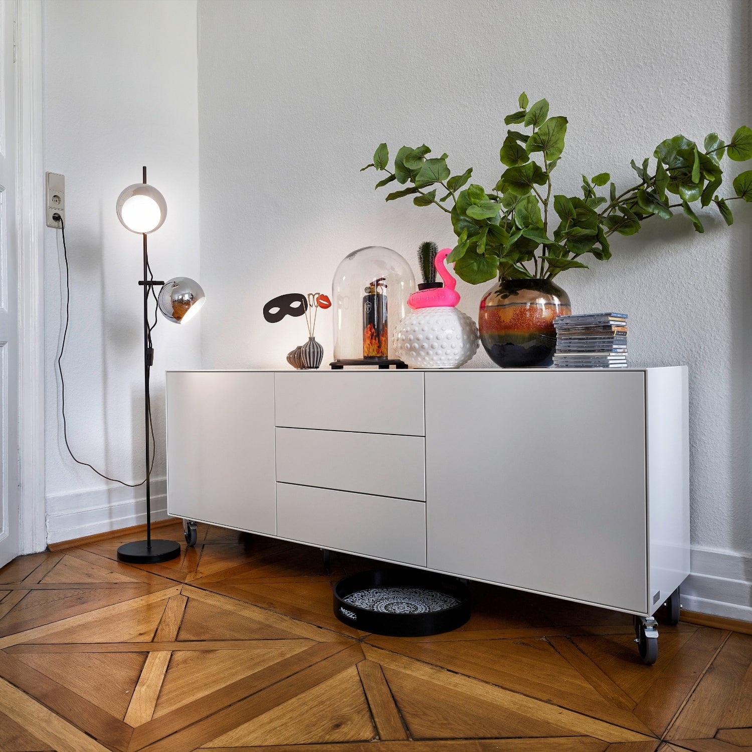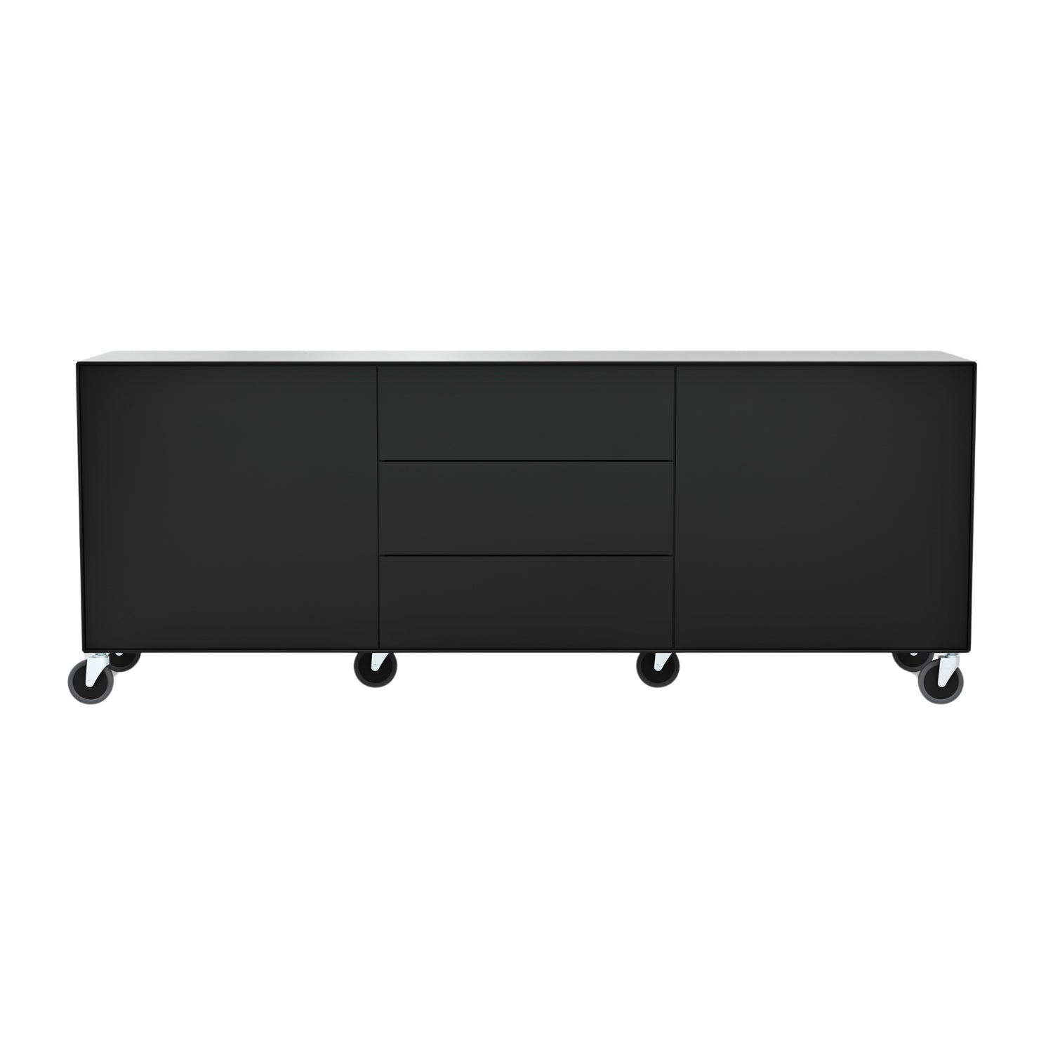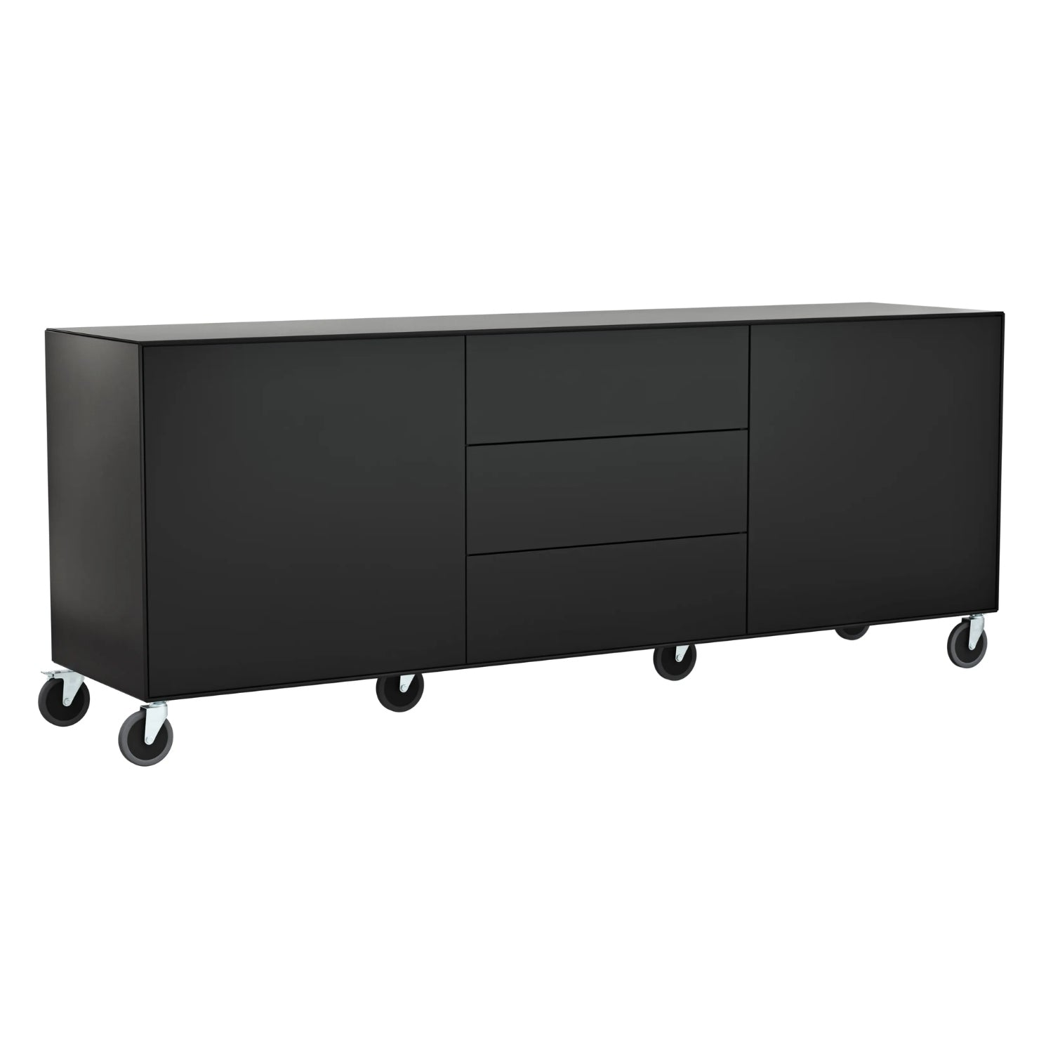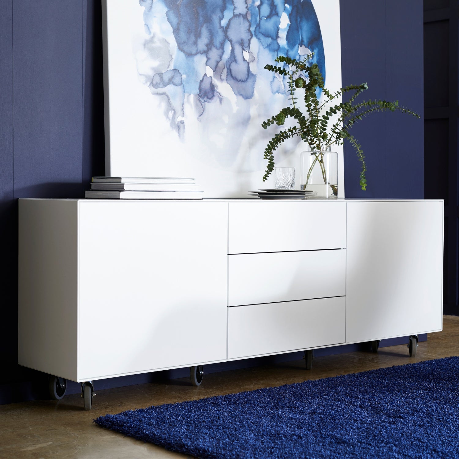 Ein besonders charmantes Detail sind die großen Rollen unter dem Sideboard, die das Möbelstück mobil machen. Du kannst deinen Lebensraum im Handumdrehen neu gestalten – zwei Rollen besitzen Feststeller, die für einen sicheren Stand sorgen.