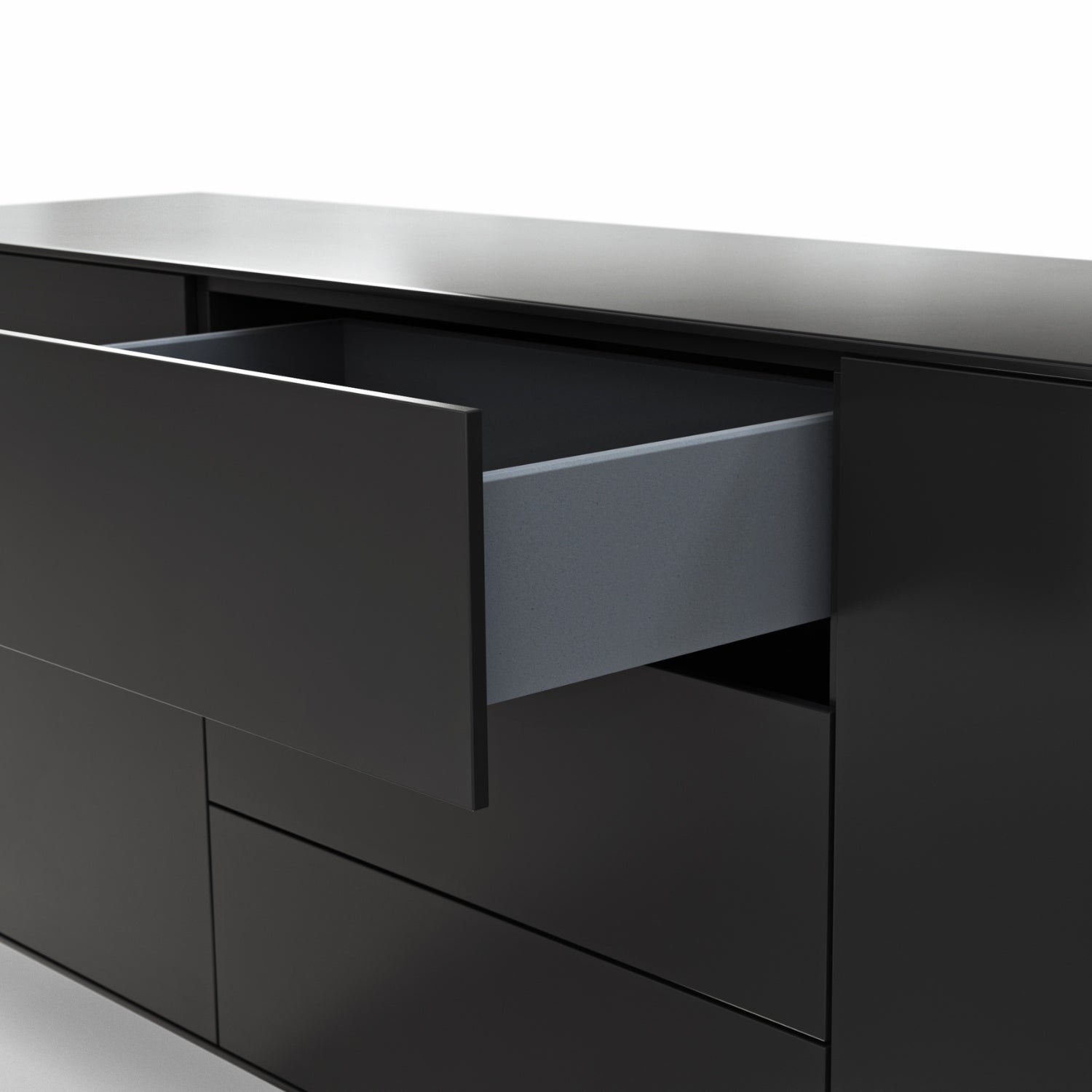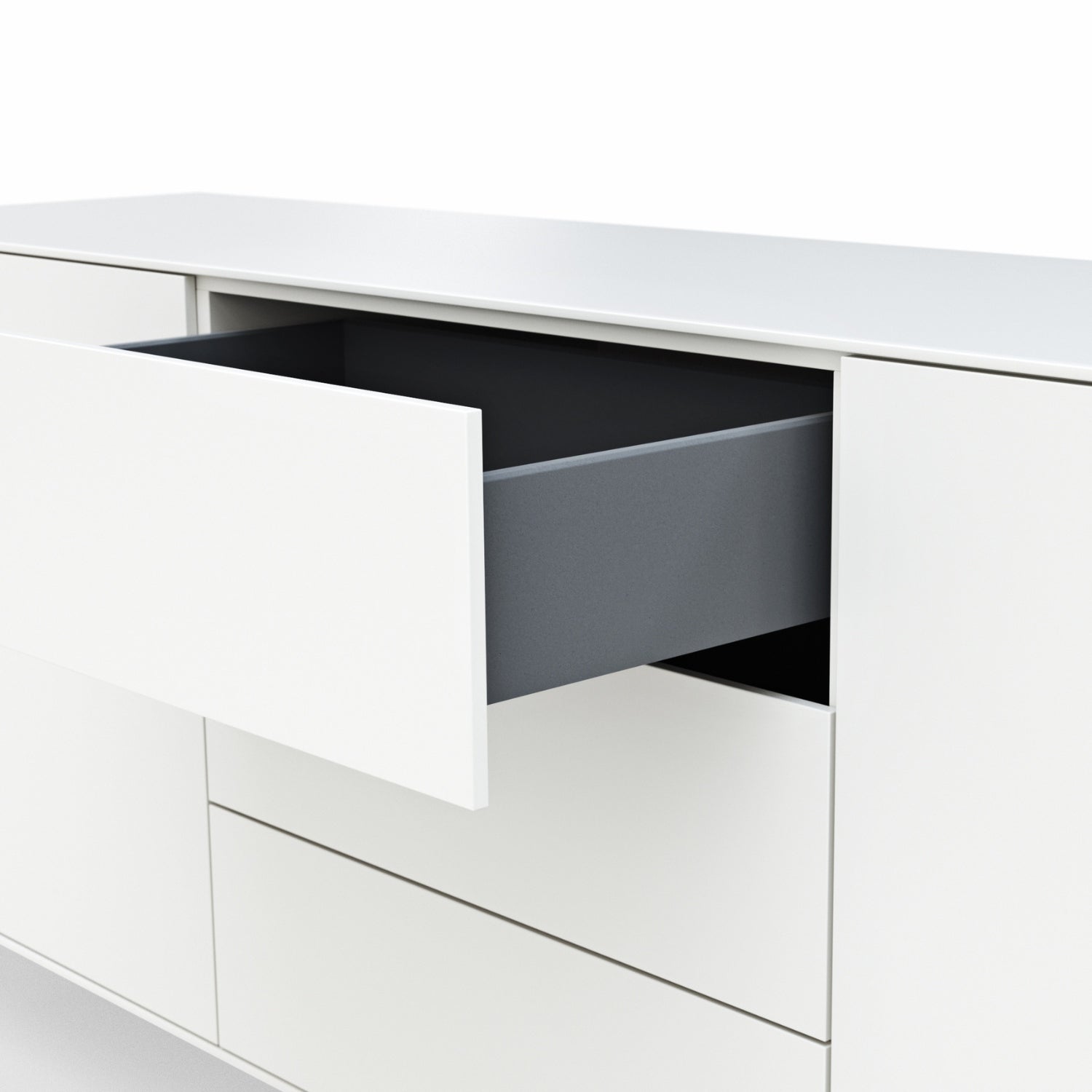Mit einer Breite von 180 cm bietet das Sideboard reichlich Stauraum, der sich hinter zwei Drehtüren und drei Schubladen verbirgt. Die hochwertige Schubladenführung mit Vollauszug ermöglicht dir einen ungehinderten Zugriff bis in die letzte Ecke, während der grifflosen Push-to-Open-Beschläge ein müheloses Öffnen der Fronten durch sanften Druck ermöglichen.