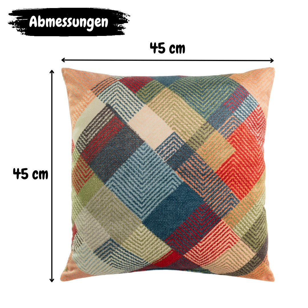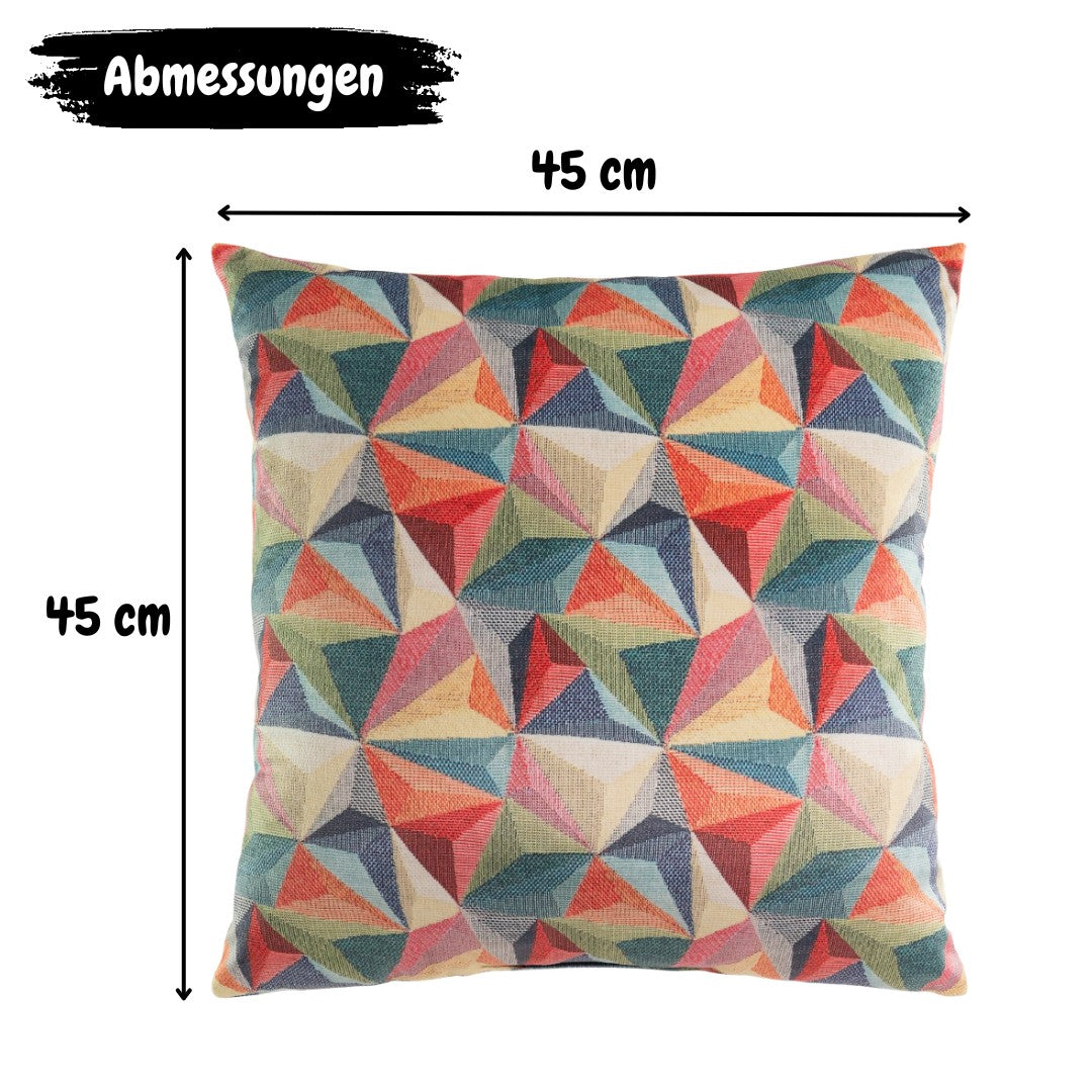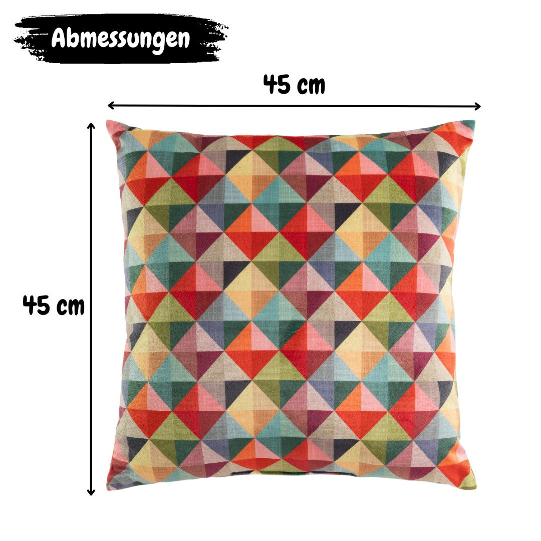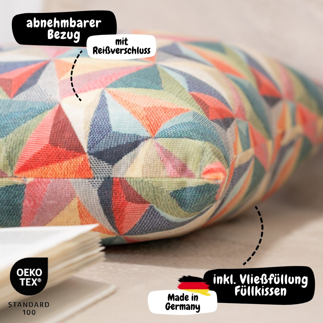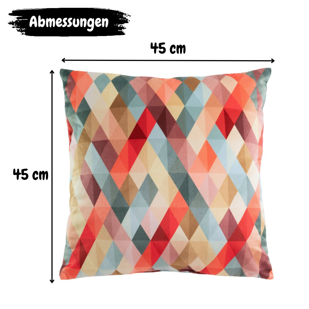 Jedes Kissen ist komplett ausgestattet mit einem samtig-weichen Kissenbezug, der in einem von fünf bunten, geometrischen Mustern erhältlich ist, die Ihre Einrichtung sofort aufwerten. Der Bezug ist abnehmbar dank eines praktischen Reißverschlusses, der nicht nur die Reinigung erleichtert, sondern auch die Möglichkeit bietet, den Look Ihres Wohnzimmers, Schlafzimmers oder jeden anderen Raum nach Belieben zu verändern.