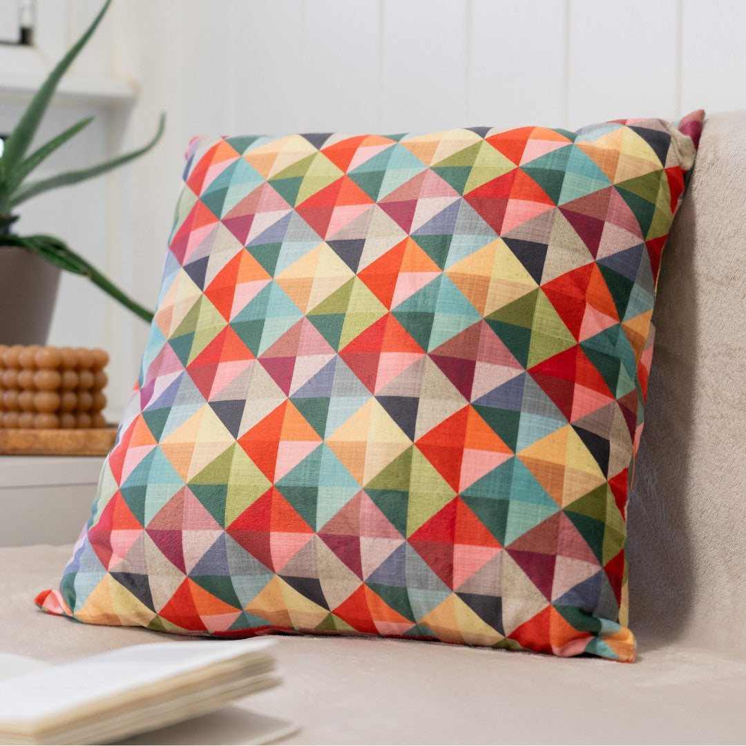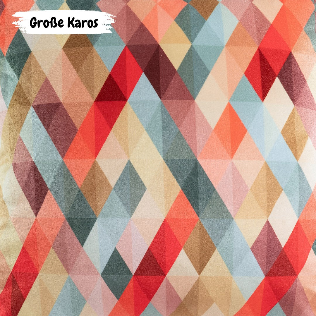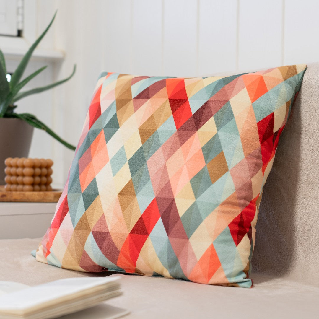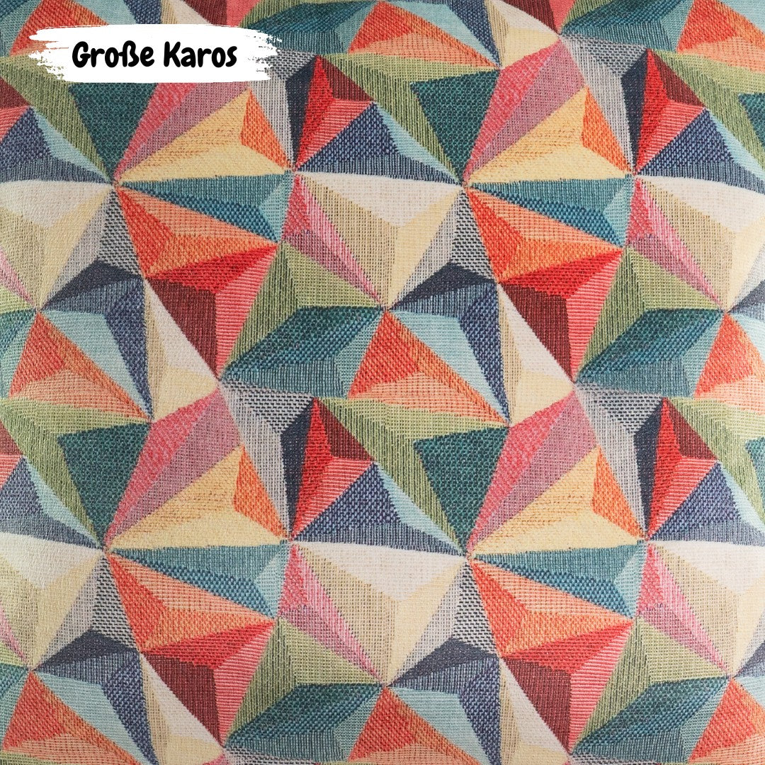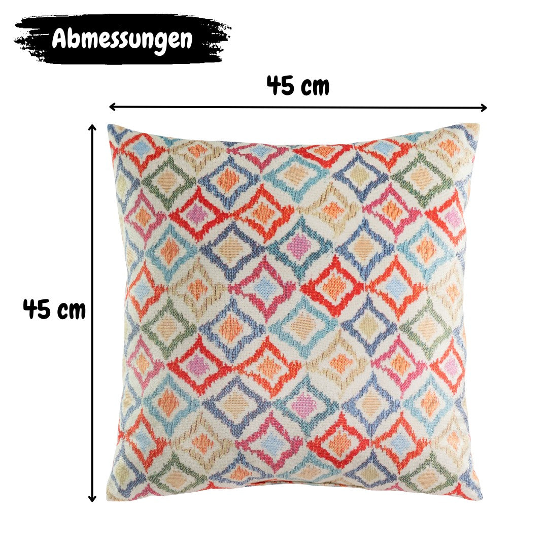 Jedes Kissen ist komplett ausgestattet mit einem samtig-weichen Kissenbezug, der in einem von fünf bunten, geometrischen Mustern erhältlich ist, die Ihre Einrichtung sofort aufwerten. Der Bezug ist abnehmbar dank eines praktischen Reißverschlusses, der nicht nur die Reinigung erleichtert, sondern auch die Möglichkeit bietet, den Look Ihres Wohnzimmers, Schlafzimmers oder jeden anderen Raum nach Belieben zu verändern.