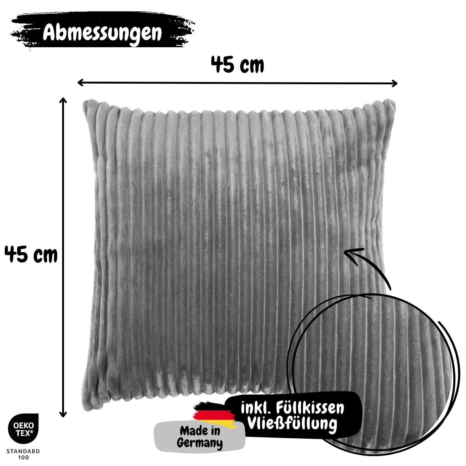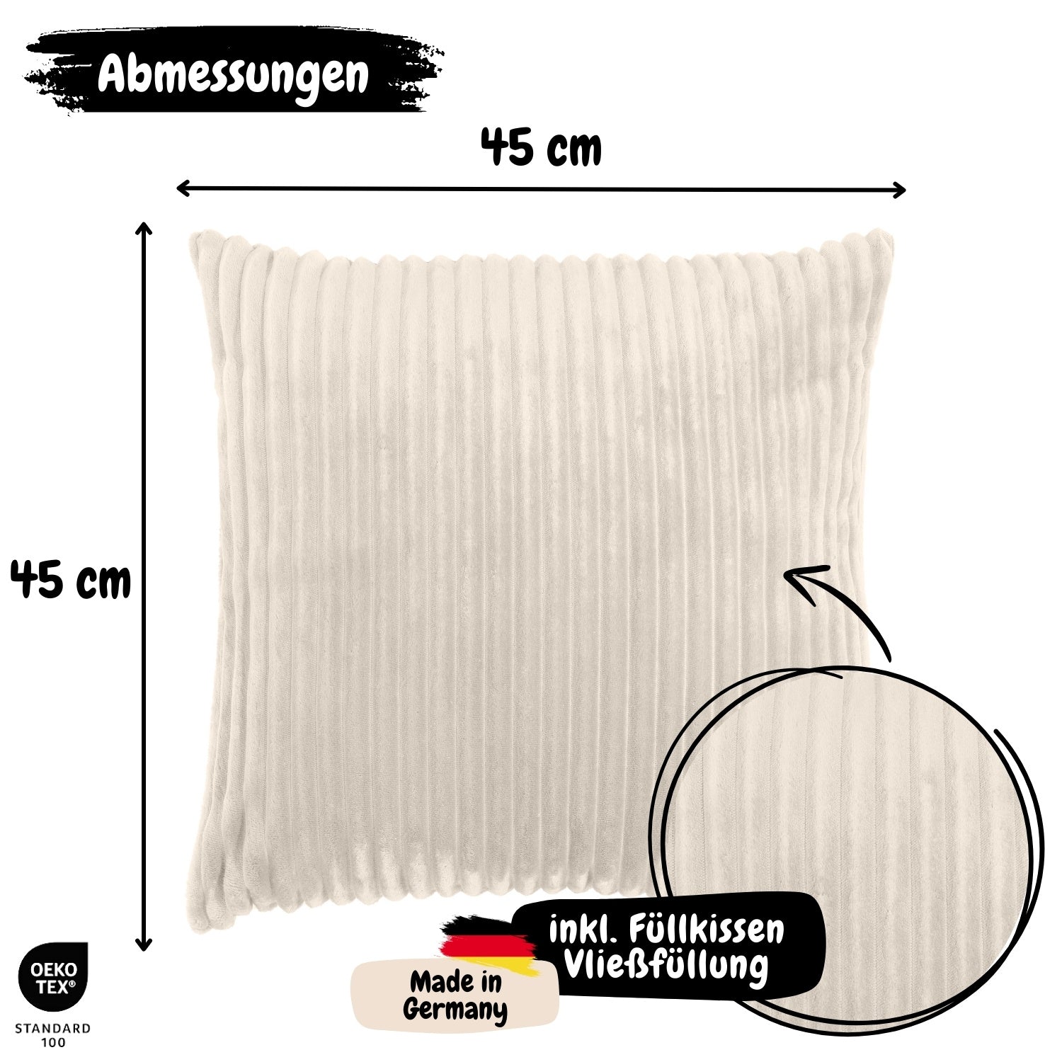 Das REALLaxx Sofakissen Miami ist die perfekte Ergänzung für Ihr Zuhause. Dieses hochwertige Dekokissen in den Maßen 45 x 45 cm vereint Stil und Funktionalität auf ideale Weise. Mit seinem kuscheligen Kord-Bezug bietet das Kissen nicht nur angenehmen Komfort, sondern setzt auch elegante Akzente in Ihrer Wohnlandschaft. Die Vorderseite besticht durch eine gestreifte Kordoptik, während die Rückseite in einem schlichten, einfarbigen Design gehalten ist – so haben Sie die Wahl, wie Sie Ihr Sofakissen präsentieren möchten.