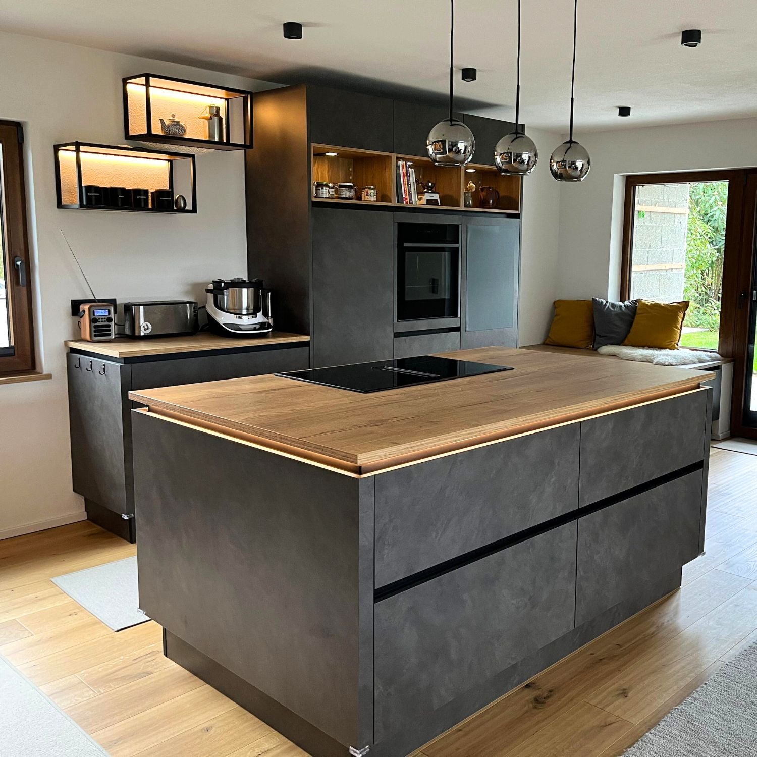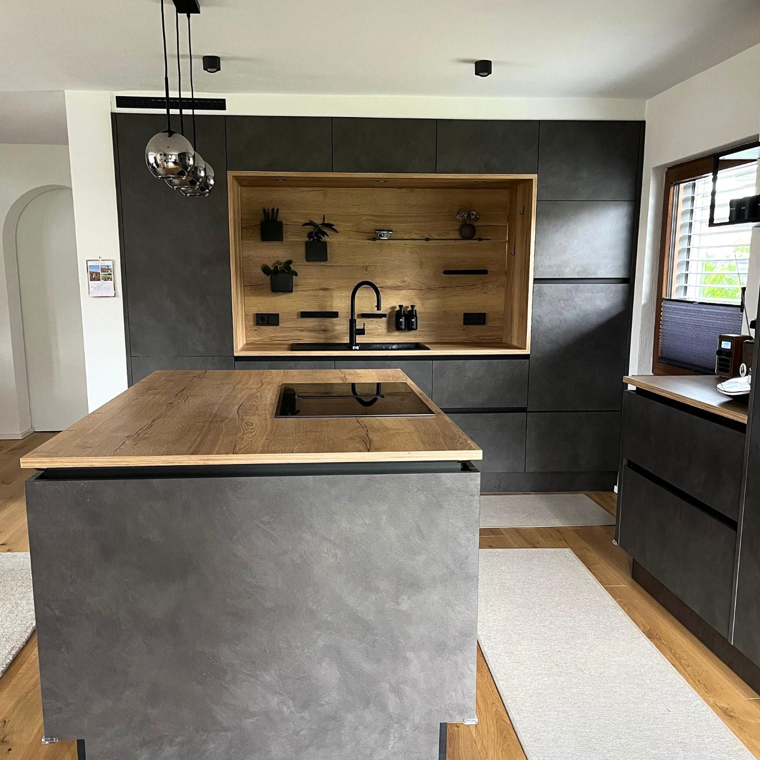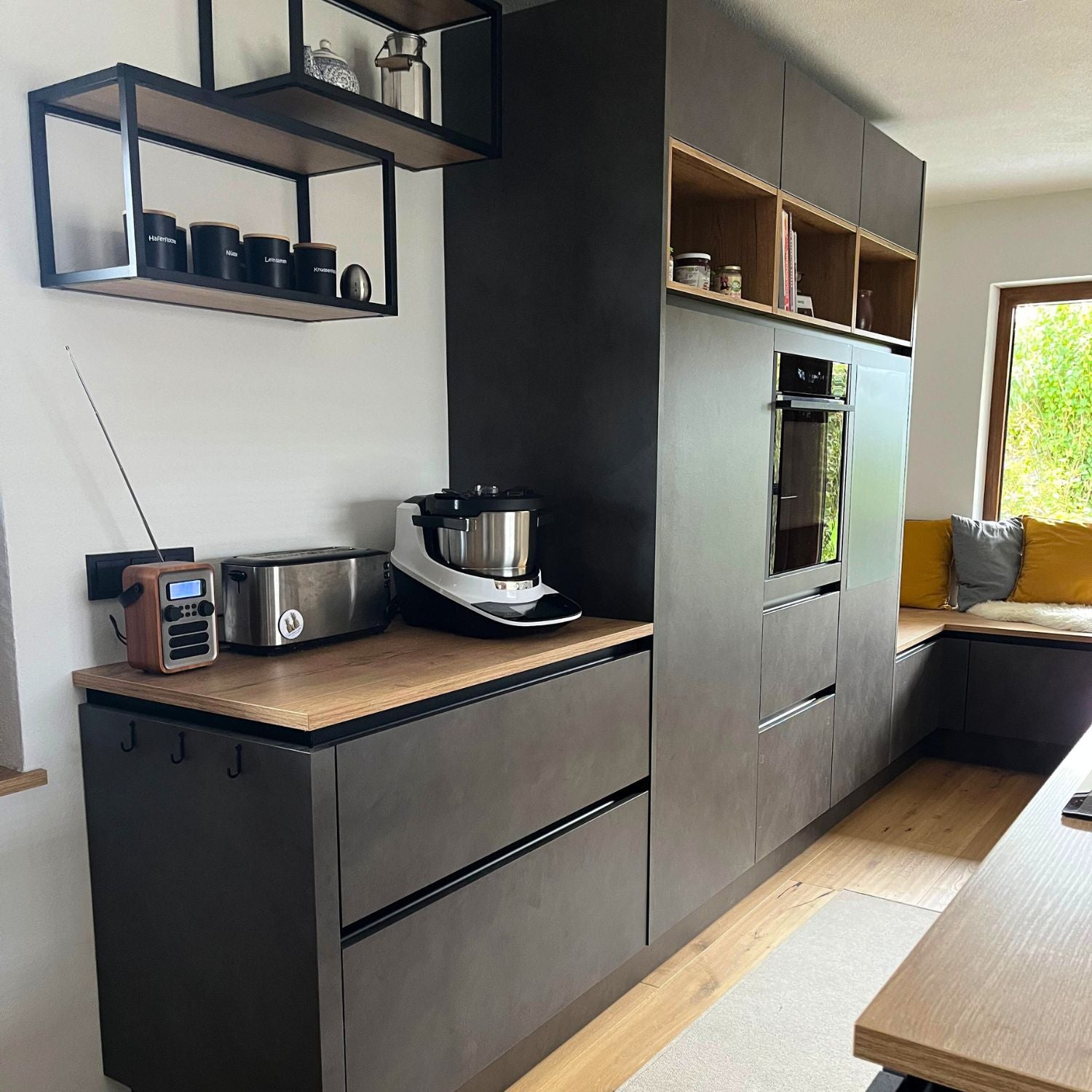 Die Arbeitsplatte in „Eiche Ventura“ mit einer Stärke von 25 mm setzt einen warmen, natürlichen Kontrapunkt zum dunklen Zementdekor. Ein besonderes Highlight ist die elegant in die Küche integrierte Sitzecke am Fenster, die zum Verweilen einlädt und den Wohnraum harmonisch erweitert. Abgerundet wird das stimmige Gesamtbild durch farblich passende schwarze Steckdosen, offene Regalelemente und praktische Organisationshelfer.