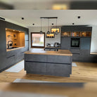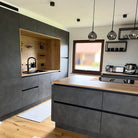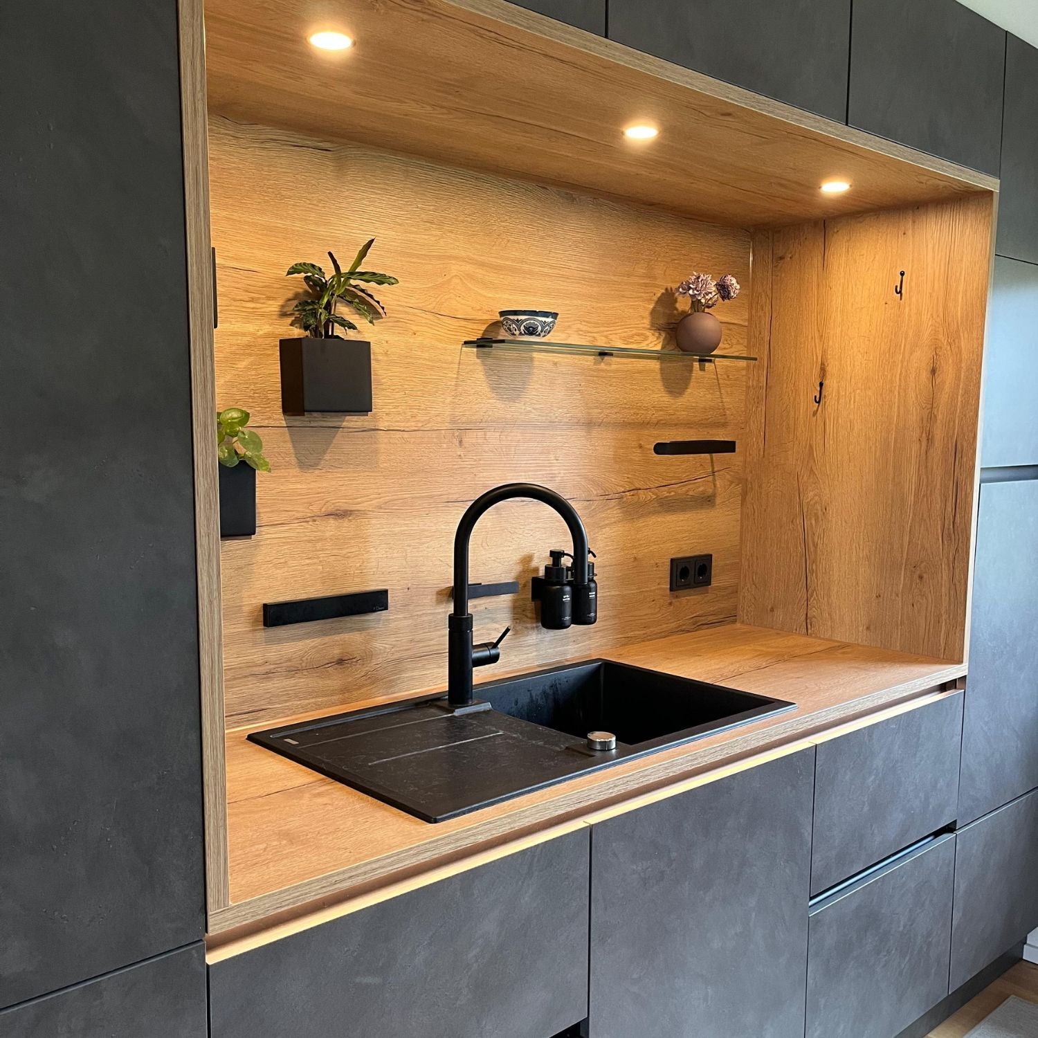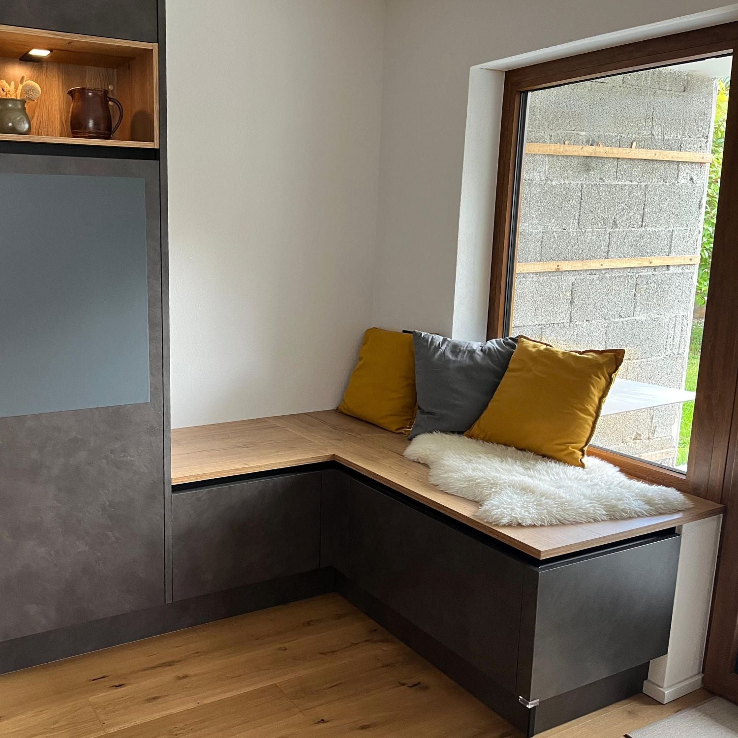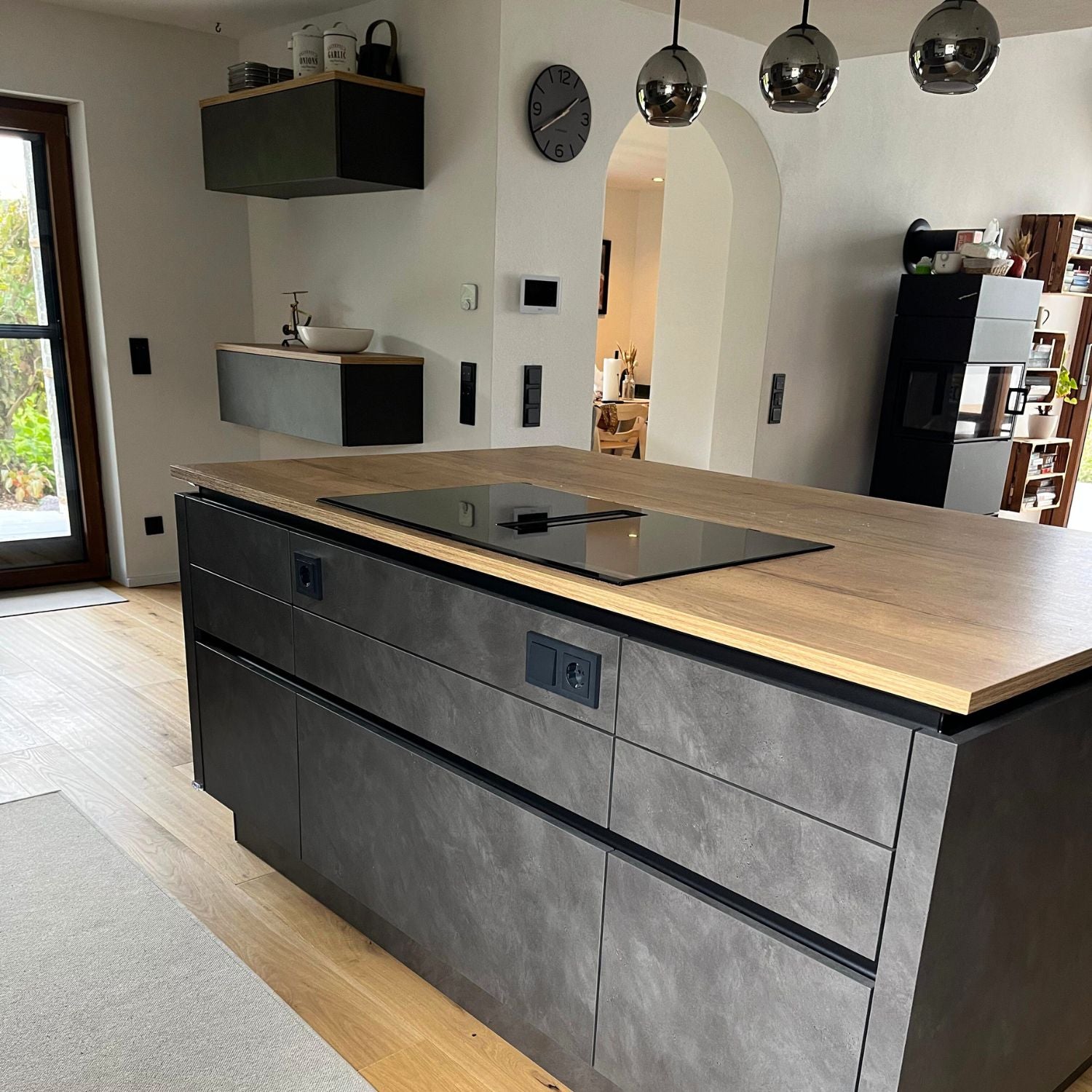 Die Arbeitsplatte in „Eiche Ventura“ mit einer Stärke von 25 mm setzt einen warmen, natürlichen Kontrapunkt zum dunklen Zementdekor. Ein besonderes Highlight ist die elegant in die Küche integrierte Sitzecke am Fenster, die zum Verweilen einlädt und den Wohnraum harmonisch erweitert. Abgerundet wird das stimmige Gesamtbild durch farblich passende schwarze Steckdosen, offene Regalelemente und praktische Organisationshelfer.