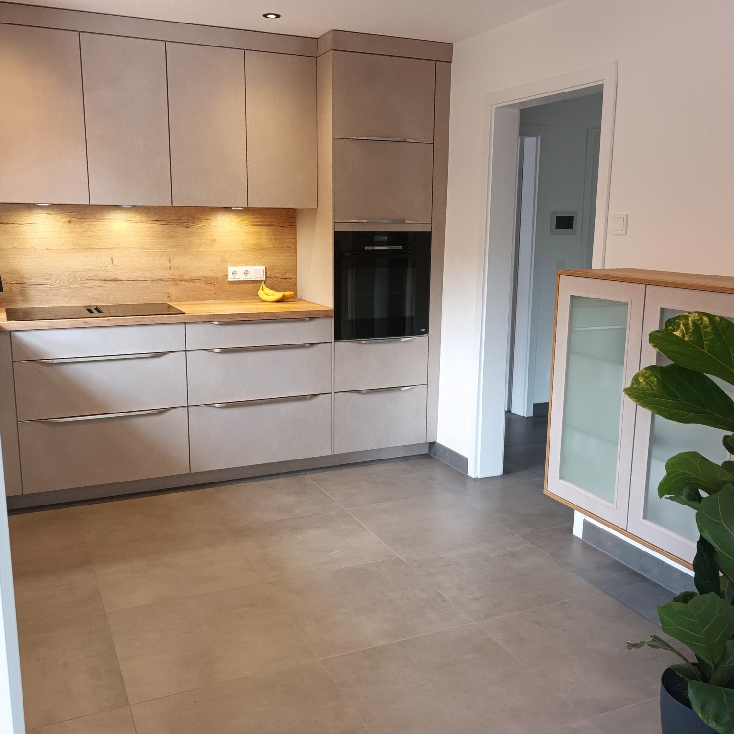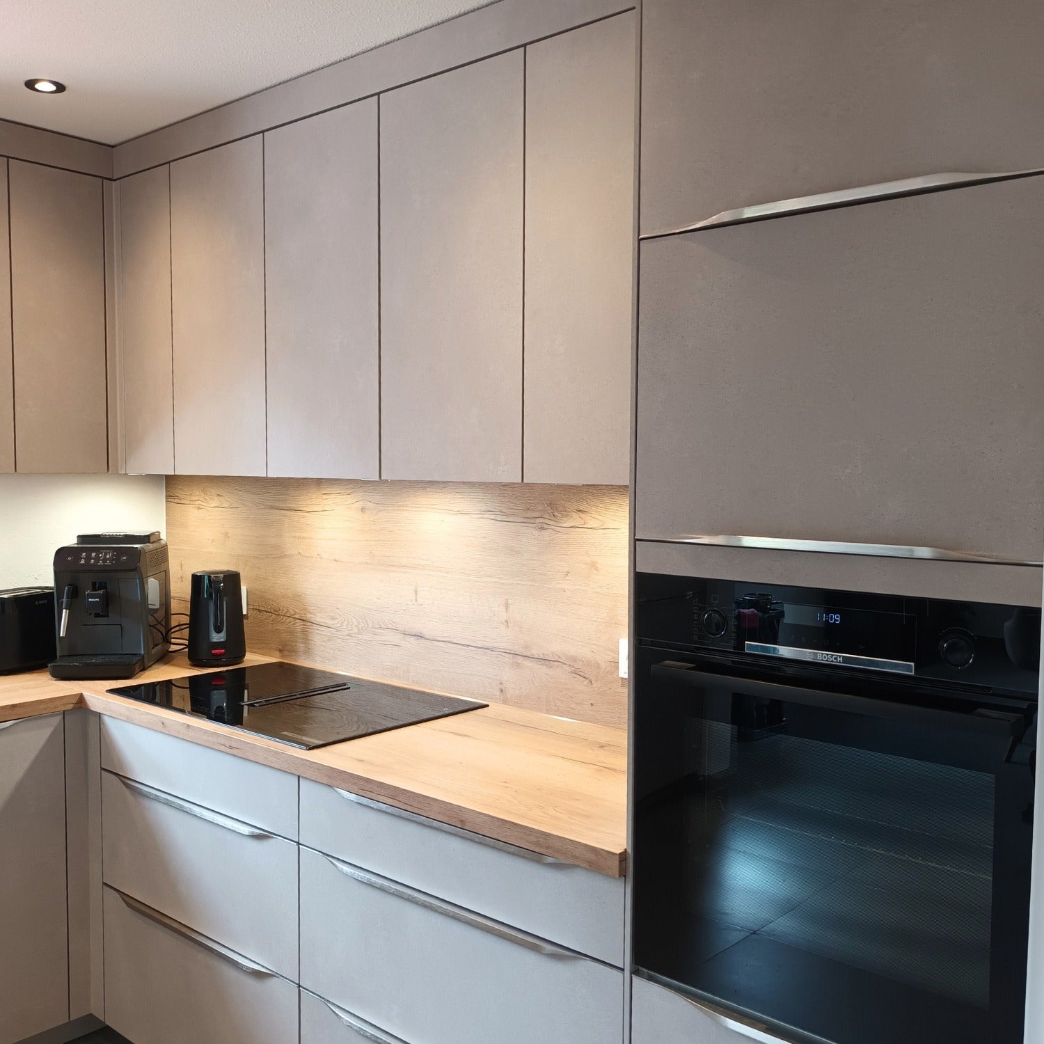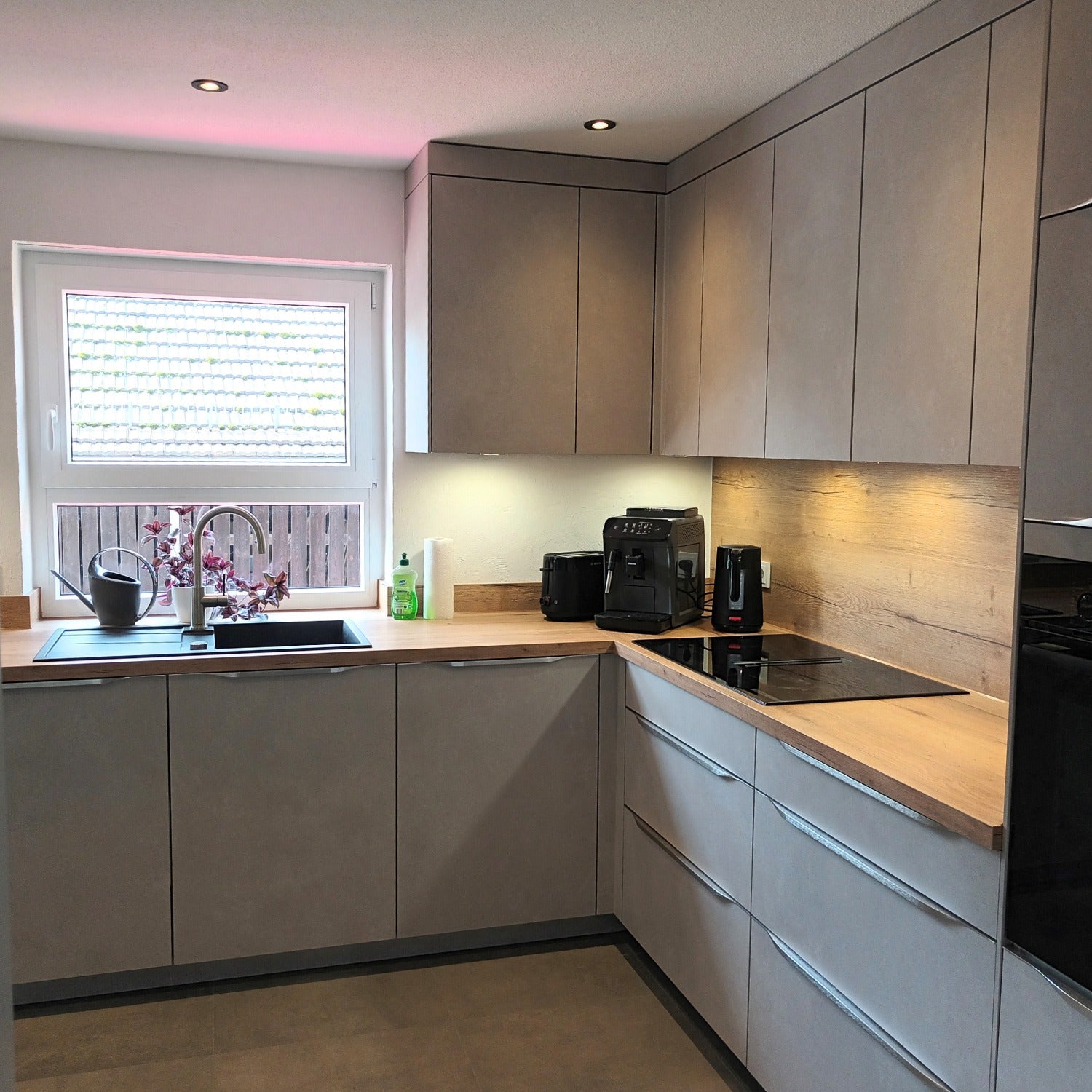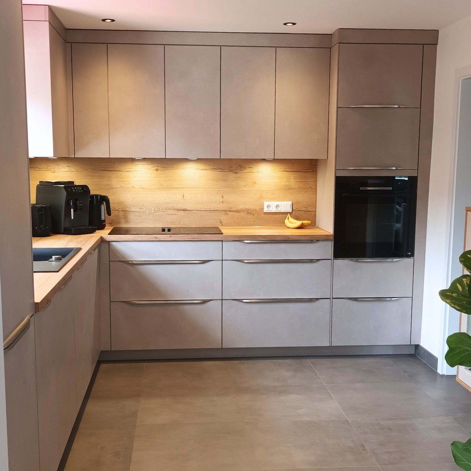 Die Küche basiert auf der Nobilia-Küchenfront Riva in der Farbe Beton Sand. Die innovativen Betonoptik-Fronten bilden eine stilvolle Alternative zu herkömmlichen Materialien und sorgen für einen modernen, urbanen Look. Dieses Design wirkt besonders harmonisch in Kombination mit der 16 mm starken, matt beschichteten Arbeitsplatte in der Farbe Eiche Sierra. Das Gesamtbild vermittelt zeitlose Eleganz und passt perfekt zu einem modernen Einrichtungsstil.