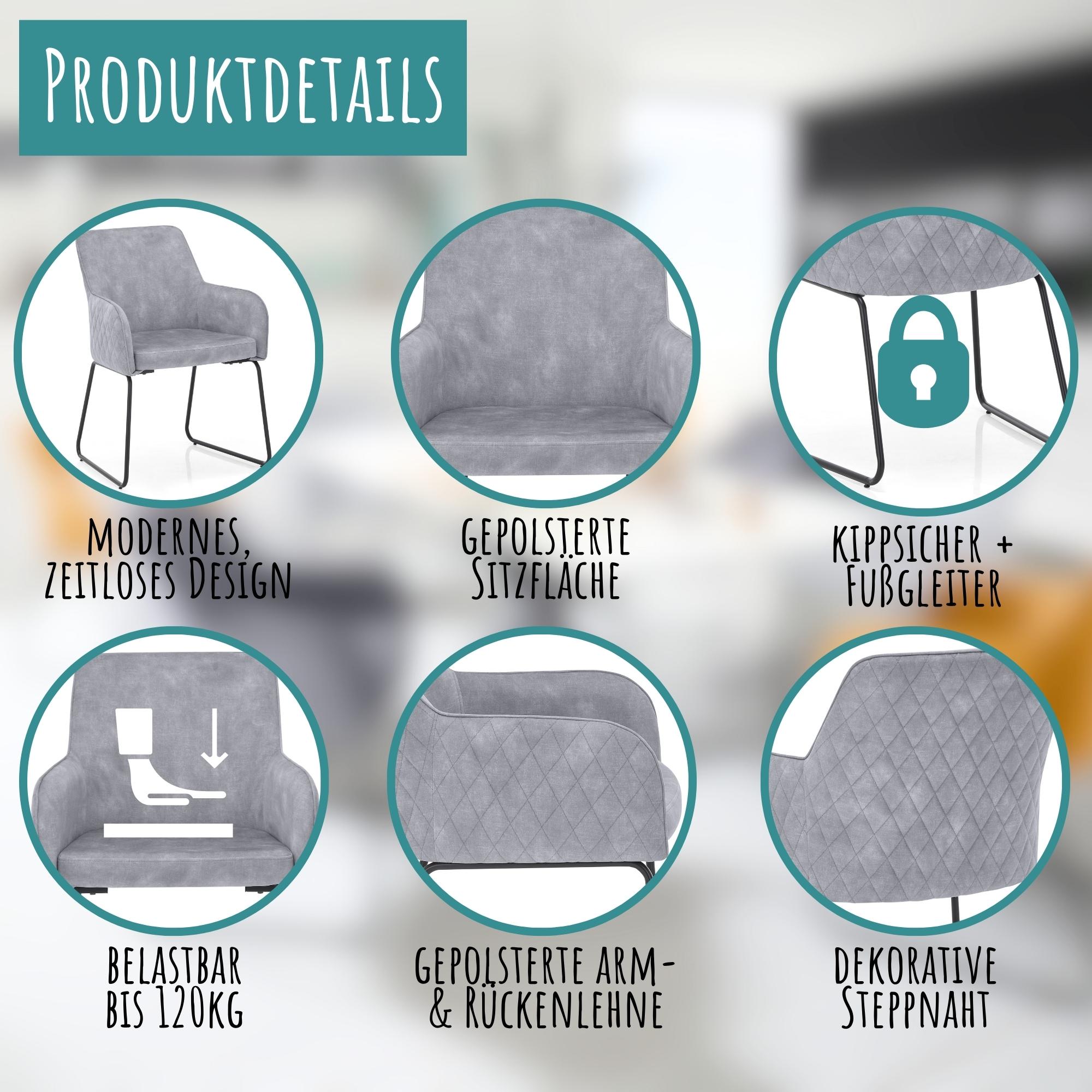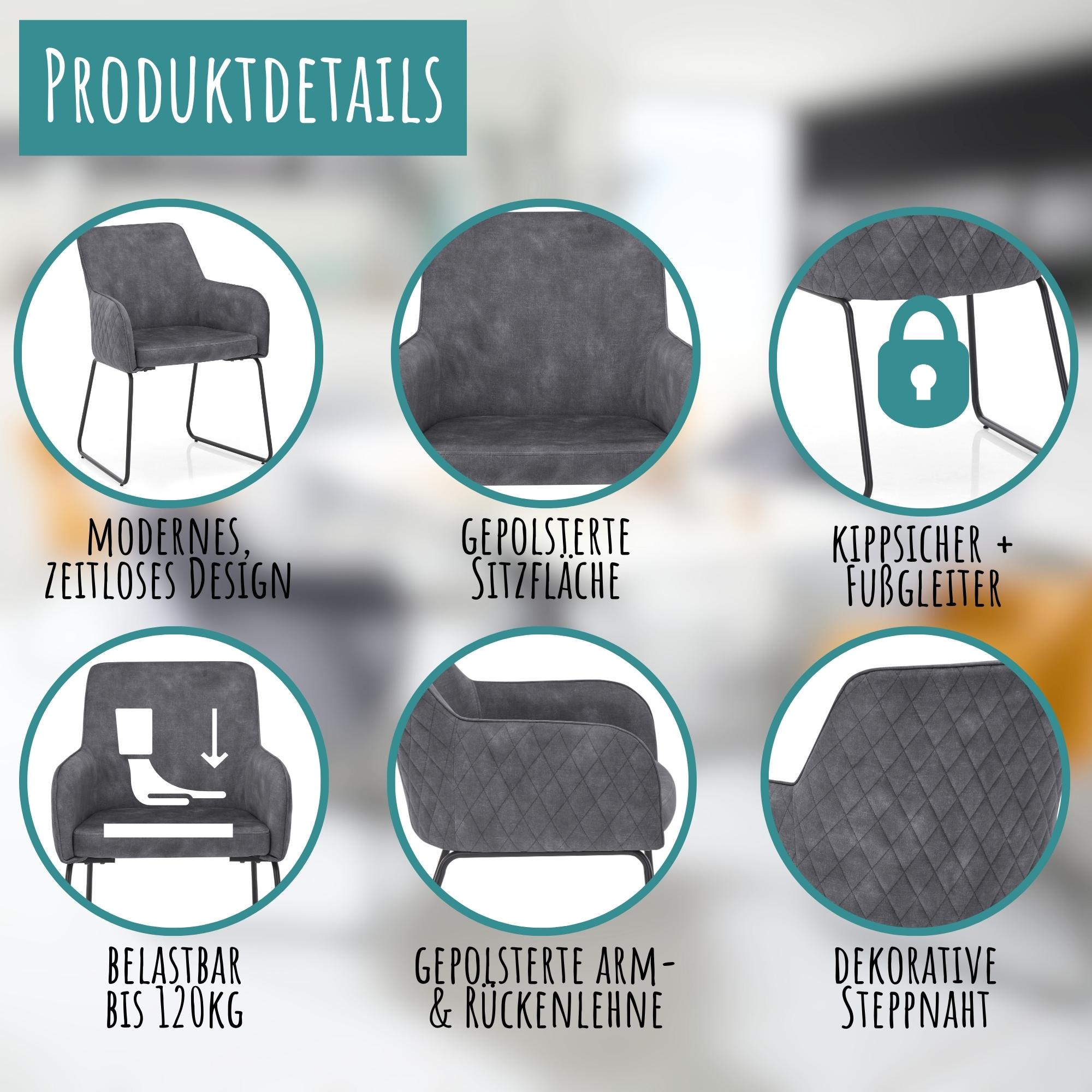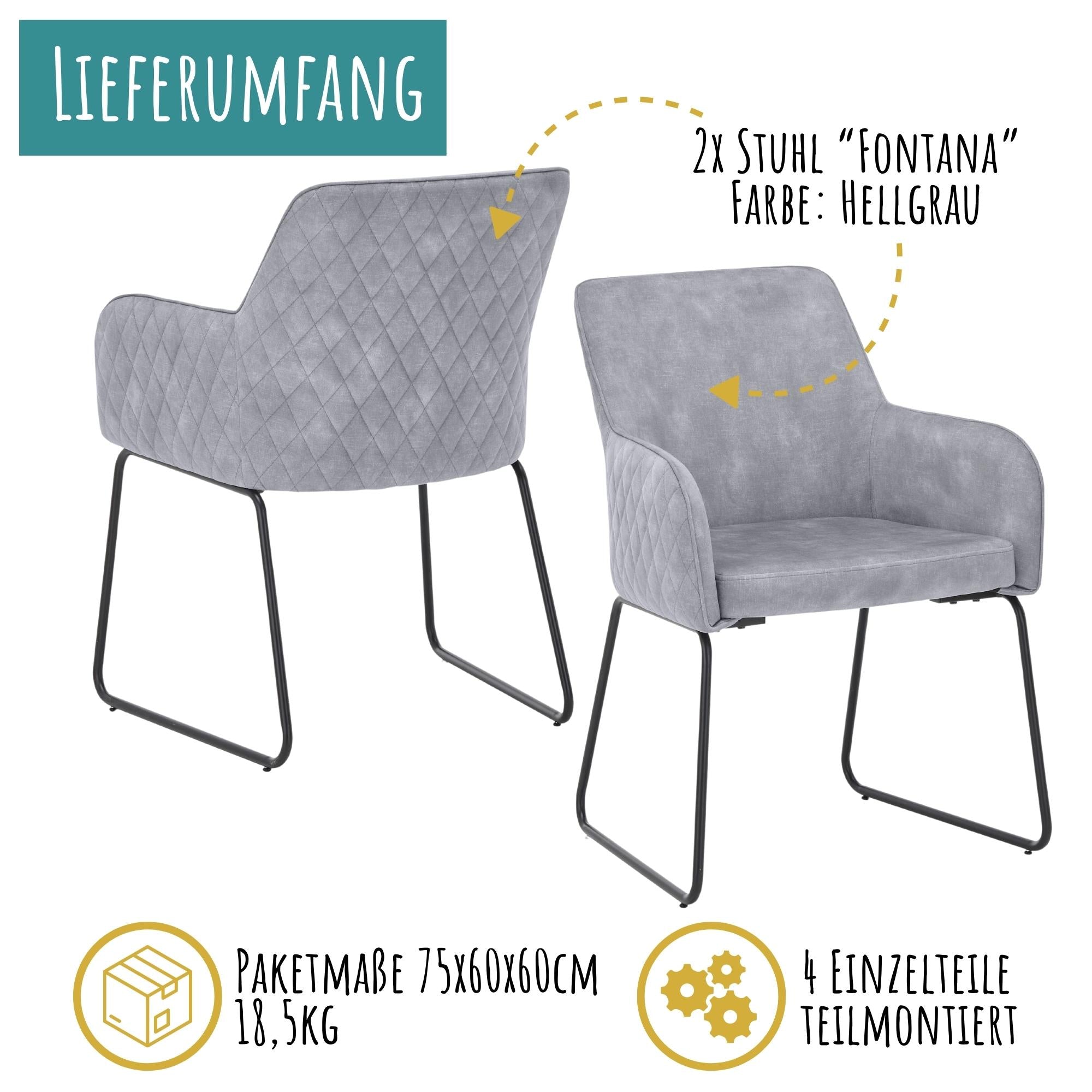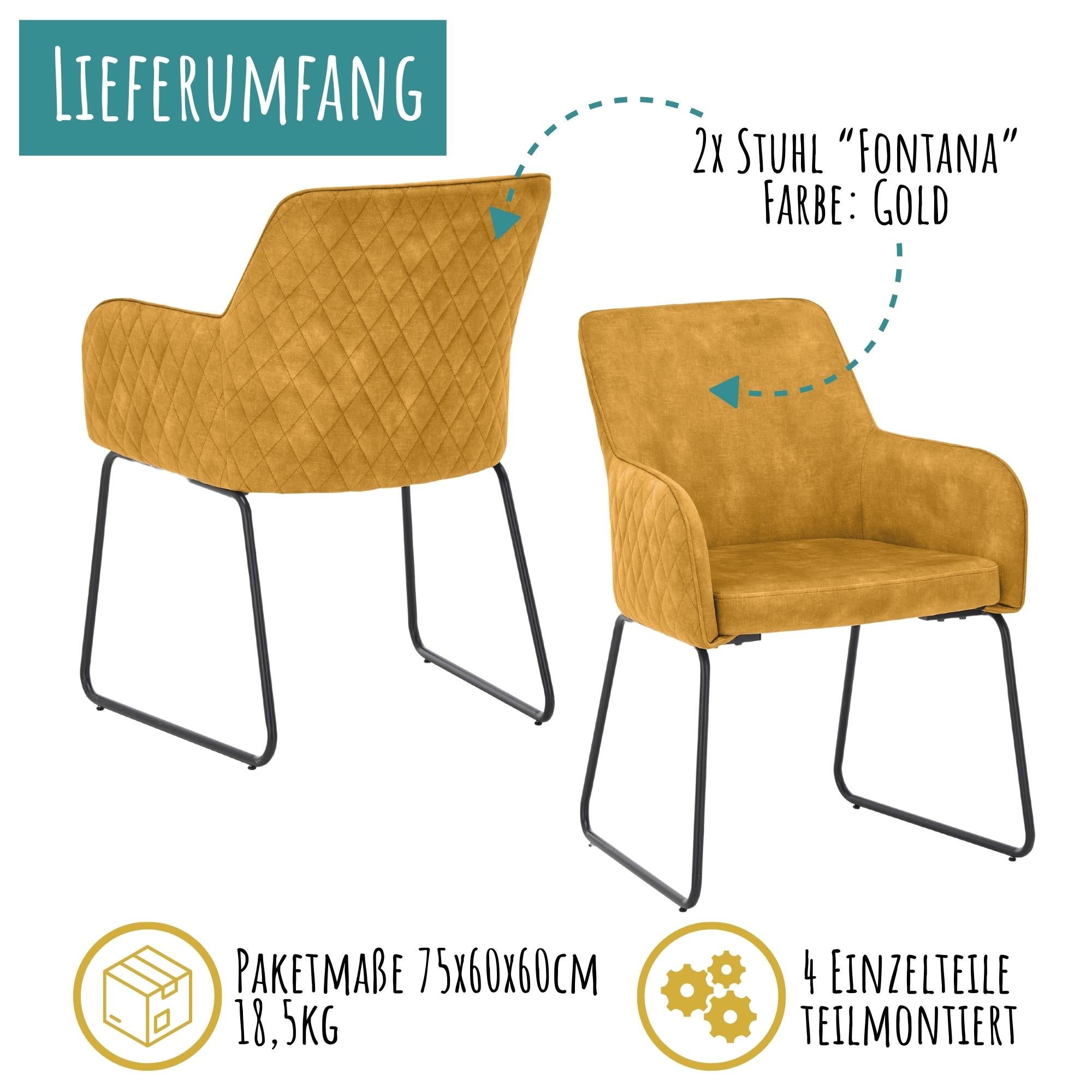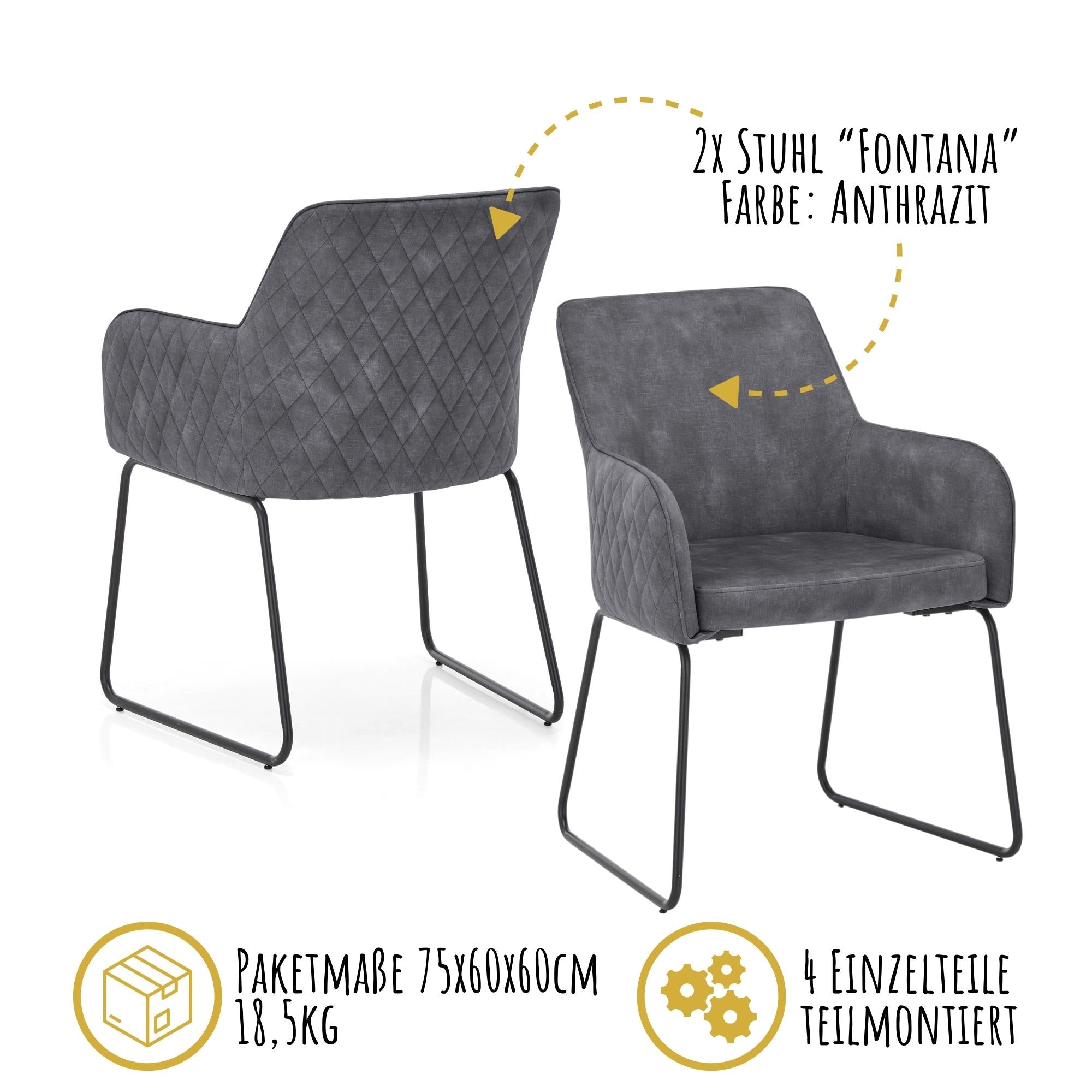 Die Sitzfläche, die Rückenlehne und die Armlehnen des Esszimmerstuhls Fontana sind großzügig mit Schaumstoff gepolstert, was ein äußerst komfortables Sitzerlebnis gewährleistet. Die Stühle sind in verschiedenen attraktiven Farbvarianten erhältlich, darunter ein helles Grau, ein elegantes Anthrazit und ein stilvolles Gold. Diese vielfältige Farbauswahl ermöglicht es, den Stuhl perfekt auf die individuelle Einrichtung abzustimmen.